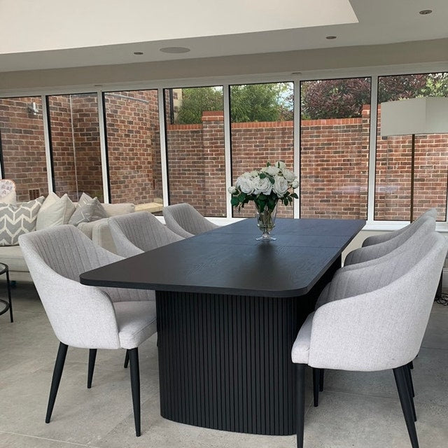 The stunning Aria dining chair is a stunning, on trend, elegant design. The combination of the padding, soft velvet and thick side bolstering provides an exceptionally comfortable dining experience. It's luxurious line stitched backrest and black metal legs makes a statement in all modern dining spaces. This chair is finished in a stunning stone upholstered fabric. 2 x Aria dining chairs come with this set.