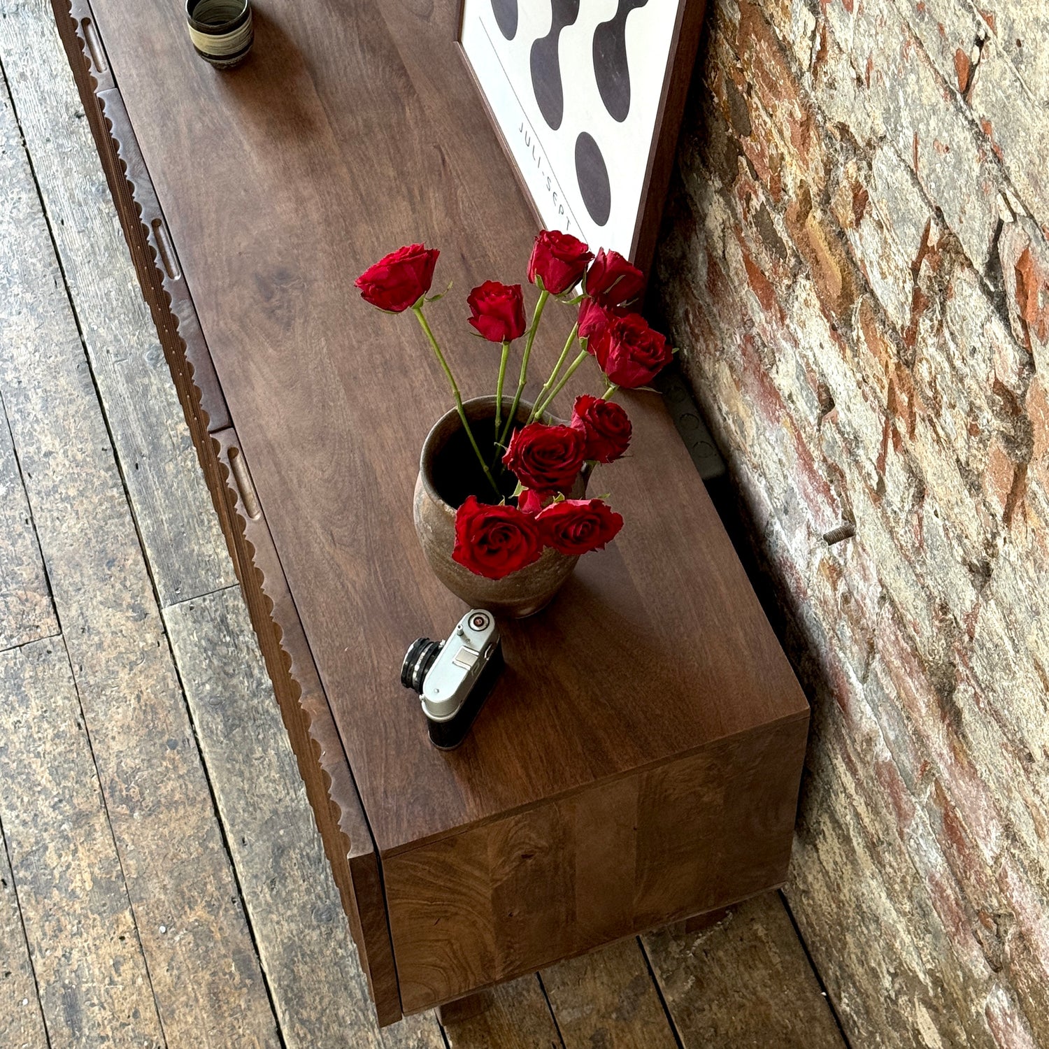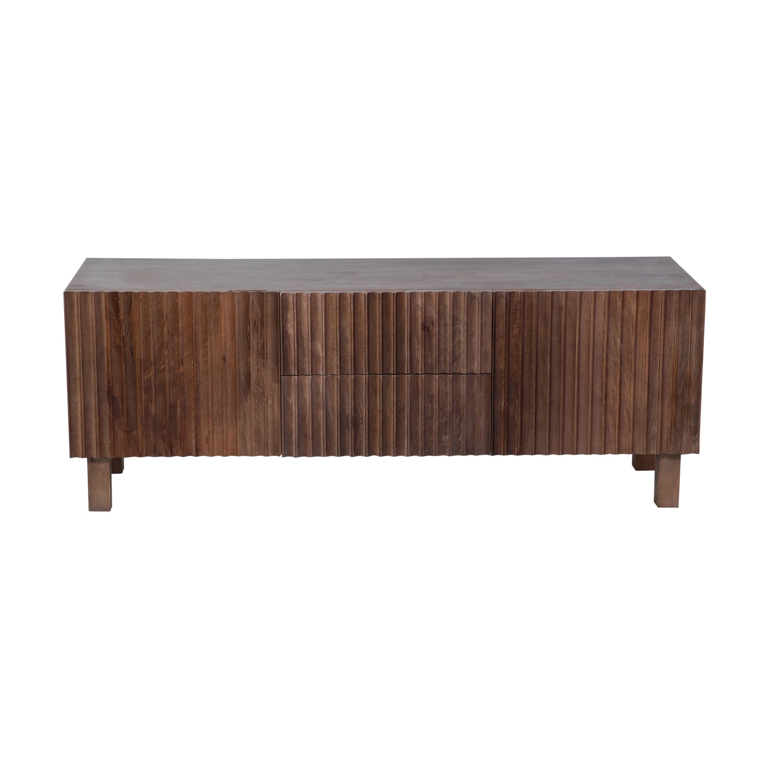 The front of the TV unit boasts an intricate engraved fluted design, adding a touch of elegance and sophistication. This unique detail showcases exceptional craftsmanship and elevates the overall aesthetic. Designed with functionality in mind, the unit includes strategically placed holes on the back for easy wire management. Keep your cables organised and out of sight, maintaining a tidy and clutter-free look.