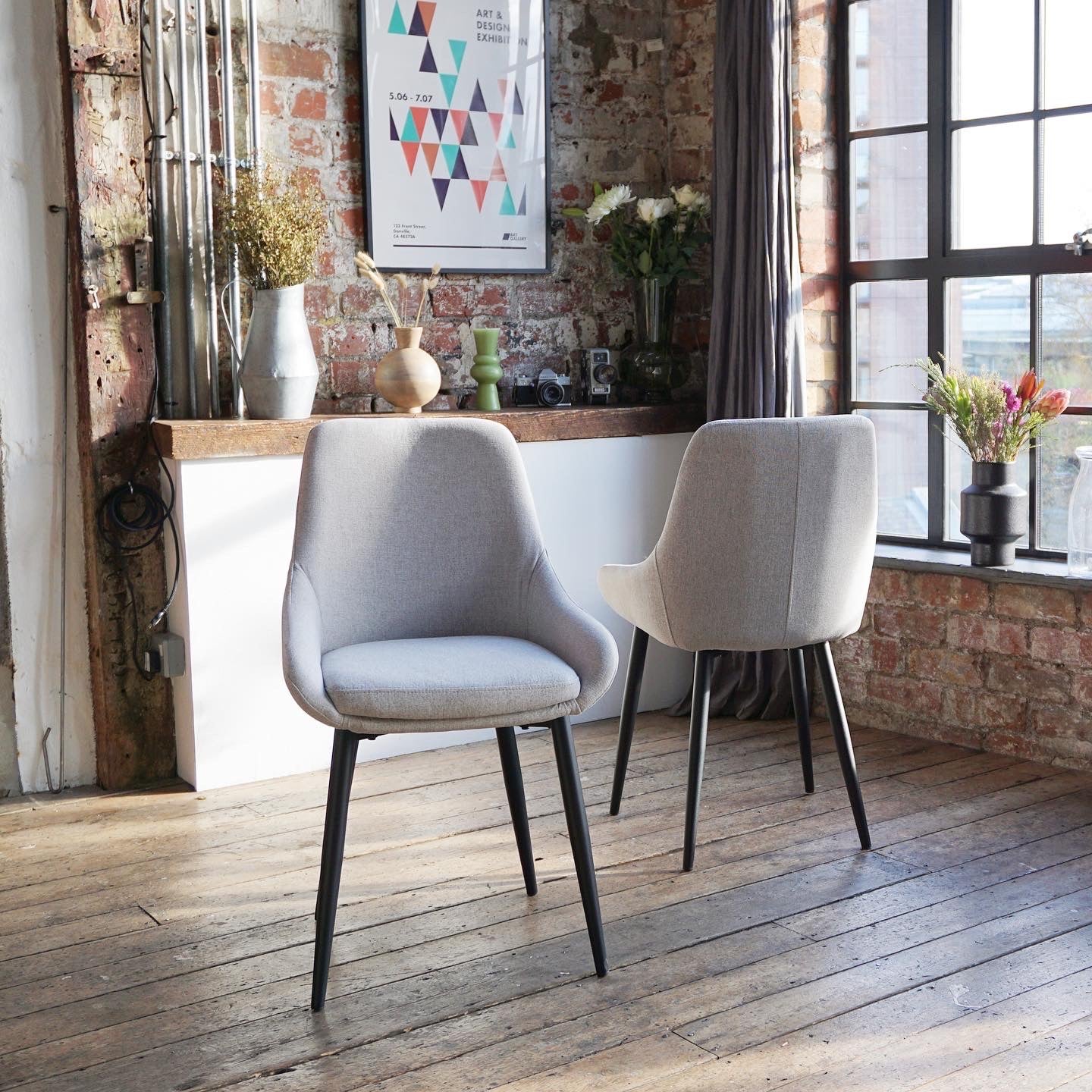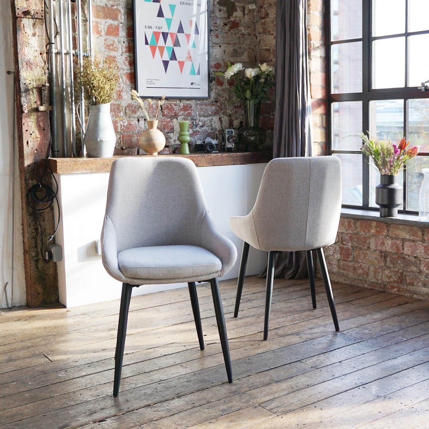 The stunning Athena scoop style dining chairs are a stunning, on trend and elegant design. The combination of the padding, fabric and thick side bolstering provides an exceptionally comfortable dining experience. It's luxurious scoop style backrest and black metal legs will make a statement in all modern dining spaces. This chair is finished in a stunning fabric finished in stone. 2 x dining chairs come with this set.