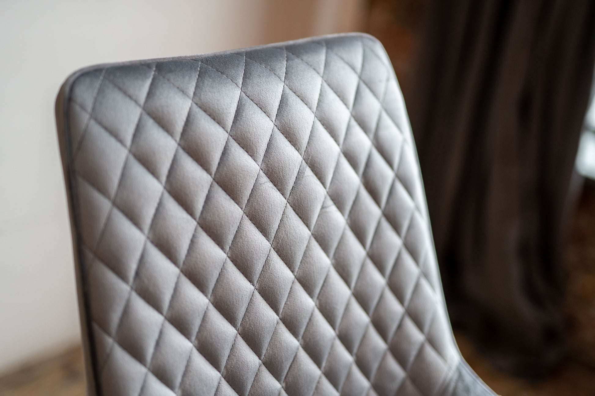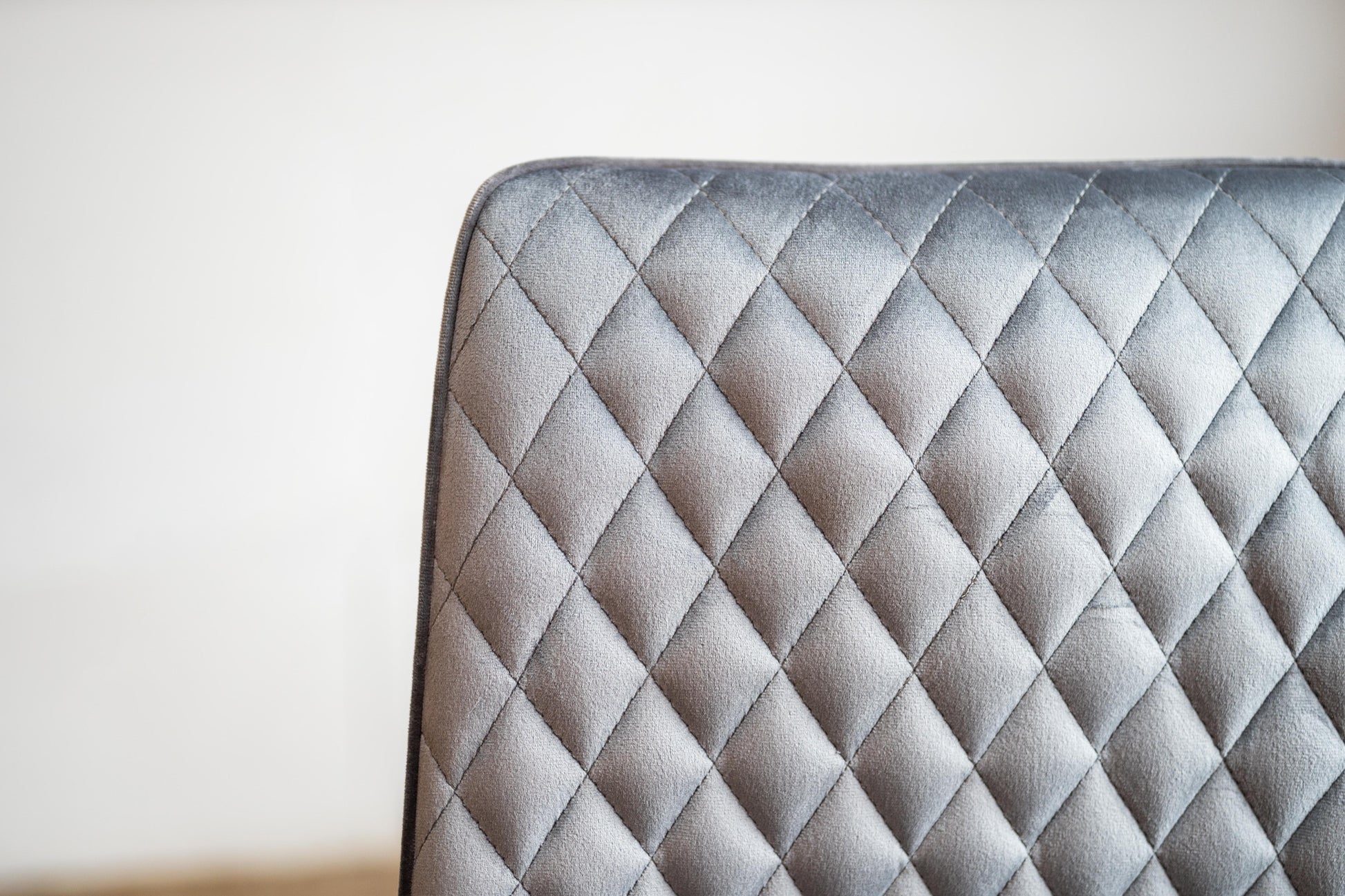 The stunning quilted Ava dining chair is an elegant design that is exceptionally comfortable. The combination of the padding and soft velvet provides a wonderful seated dining experience. Its luxurious quilted backrest and slim black metal legs makes a statement in all modern dining spaces. This chair is finished in a stunning grey velvet. 2 x Ava dining chairs come with this set.
