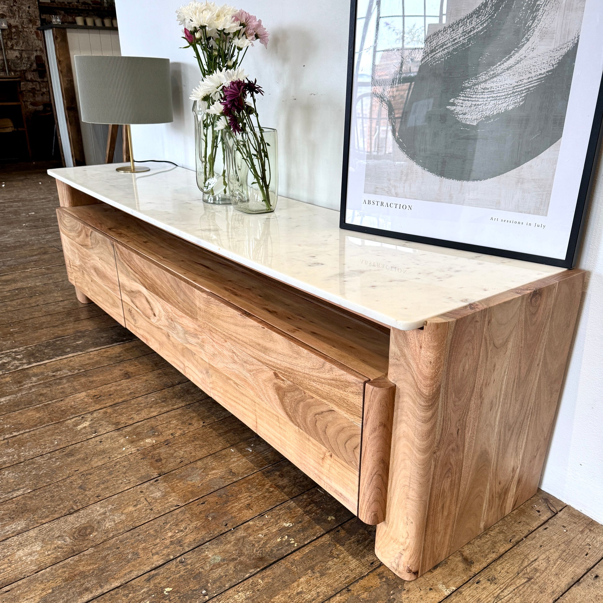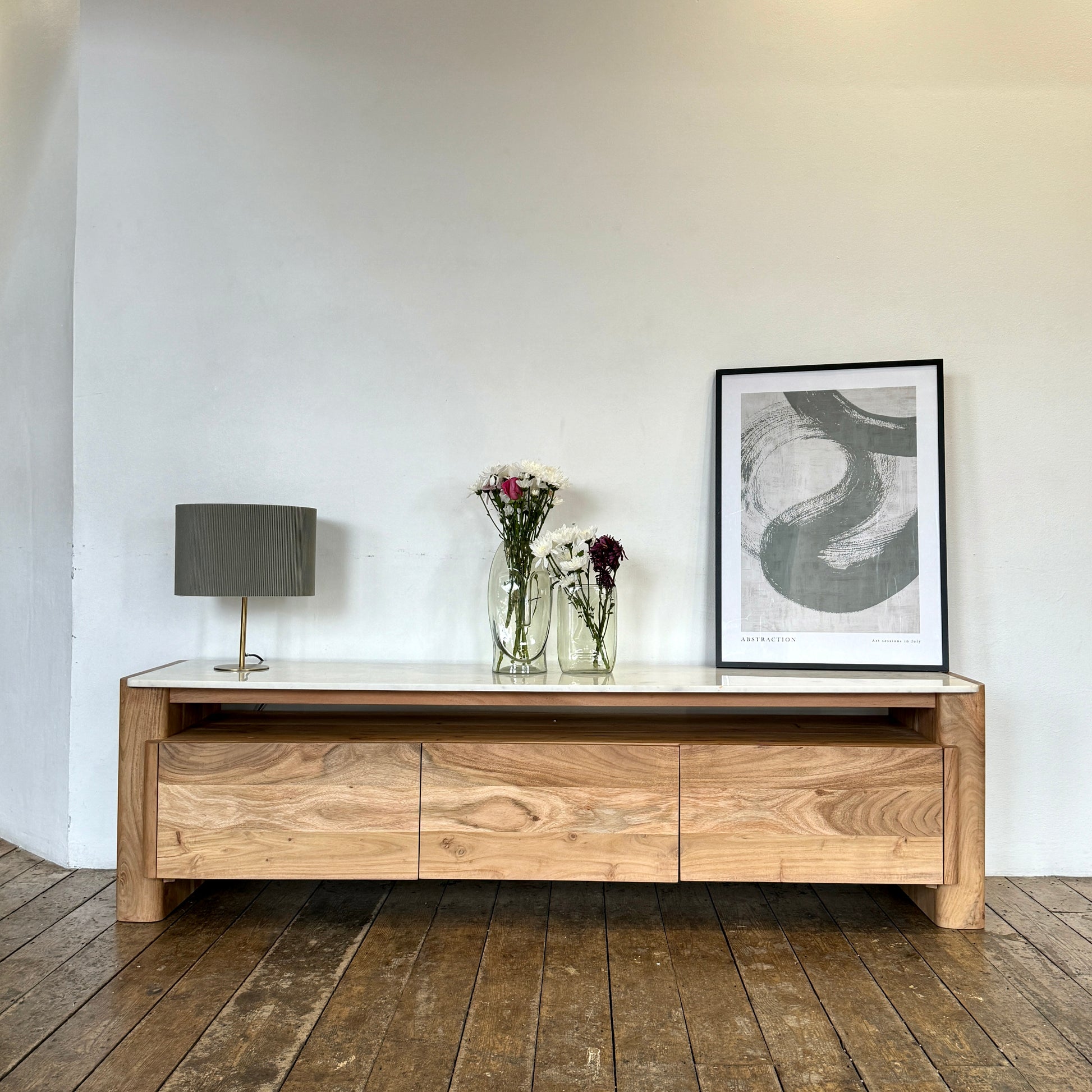 Introduce timeless elegance to your living room with the Bali acacia wood & marble TV unit. This exquisitely crafted piece features a solid acacia wood construction in a natural oak finish that radiates warmth and sophistication. The design perfectly blends coastal charm with functional modernity, making it an ideal choice for a variety of decor themes.