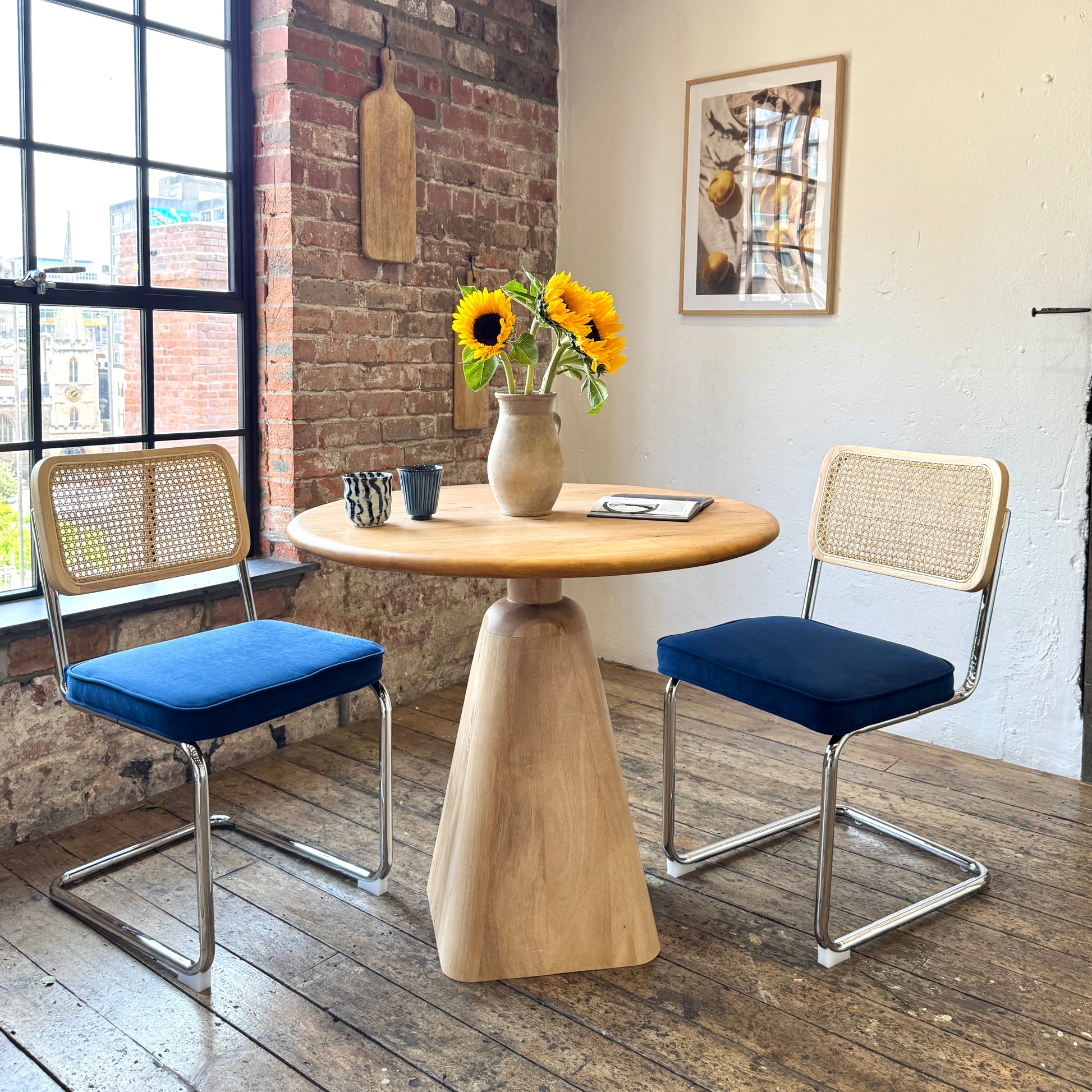 The plush seat cushion, upholstered in vibrant blue velvet, introduces a bold pop of colour while offering exceptional comfort and support. With its striking design and meticulous craftsmanship, the Brooklyn dining chair transforms your dining area into a stylish and sophisticated statement piece.