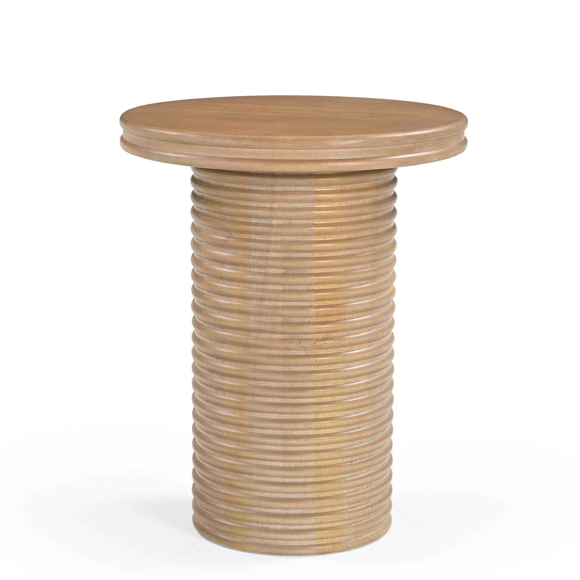Finished in a light cedar colour, the table showcases the wood's natural beauty, enhancing the grain and creating a warm, inviting atmosphere. The combination of the ribbed base and smooth round top offers a perfect balance of modern style and timeless charm, making this side table a versatile addition to any home.
