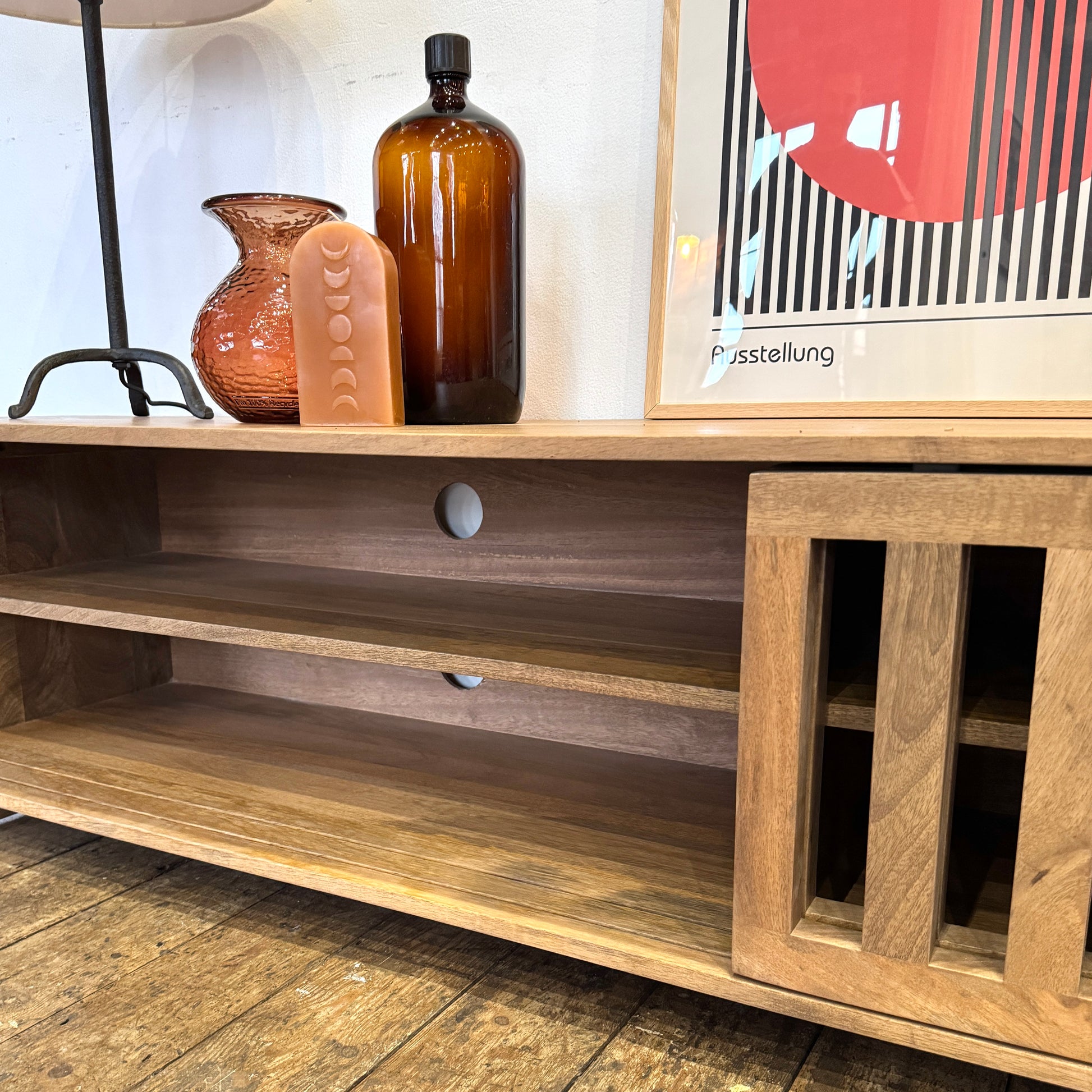 The Caleb TV Unit features two sliding doors that glide effortlessly to reveal generous storage space. This design not only enhances the unit's sleek aesthetic but also offers easy access to your media devices and accessories.
