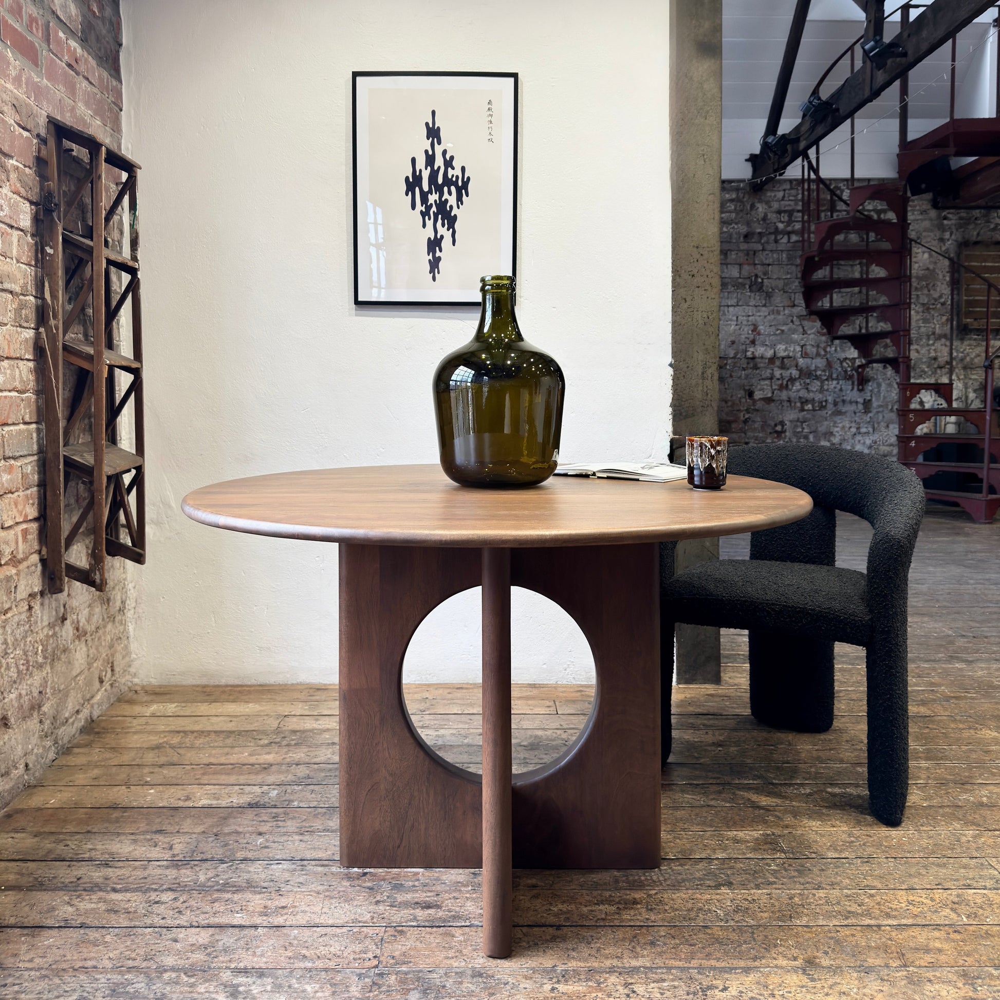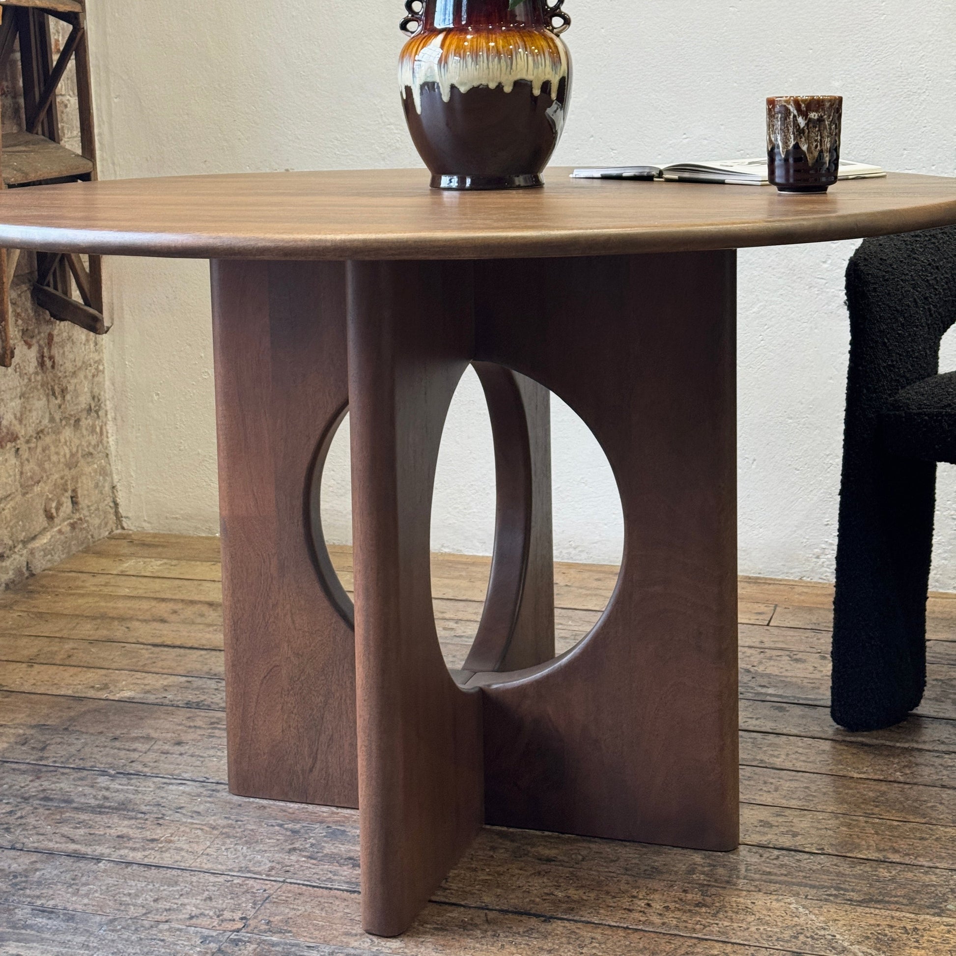 Bring warmth and sophistication to your dining space with the Chicago dining table. Lovingly handcrafted from solid mango wood, this round table showcases the rich beauty of natural timber. Finished in a beautiful brown stain, the wood’s organic grain and texture shine through, adding character and depth to any interior.