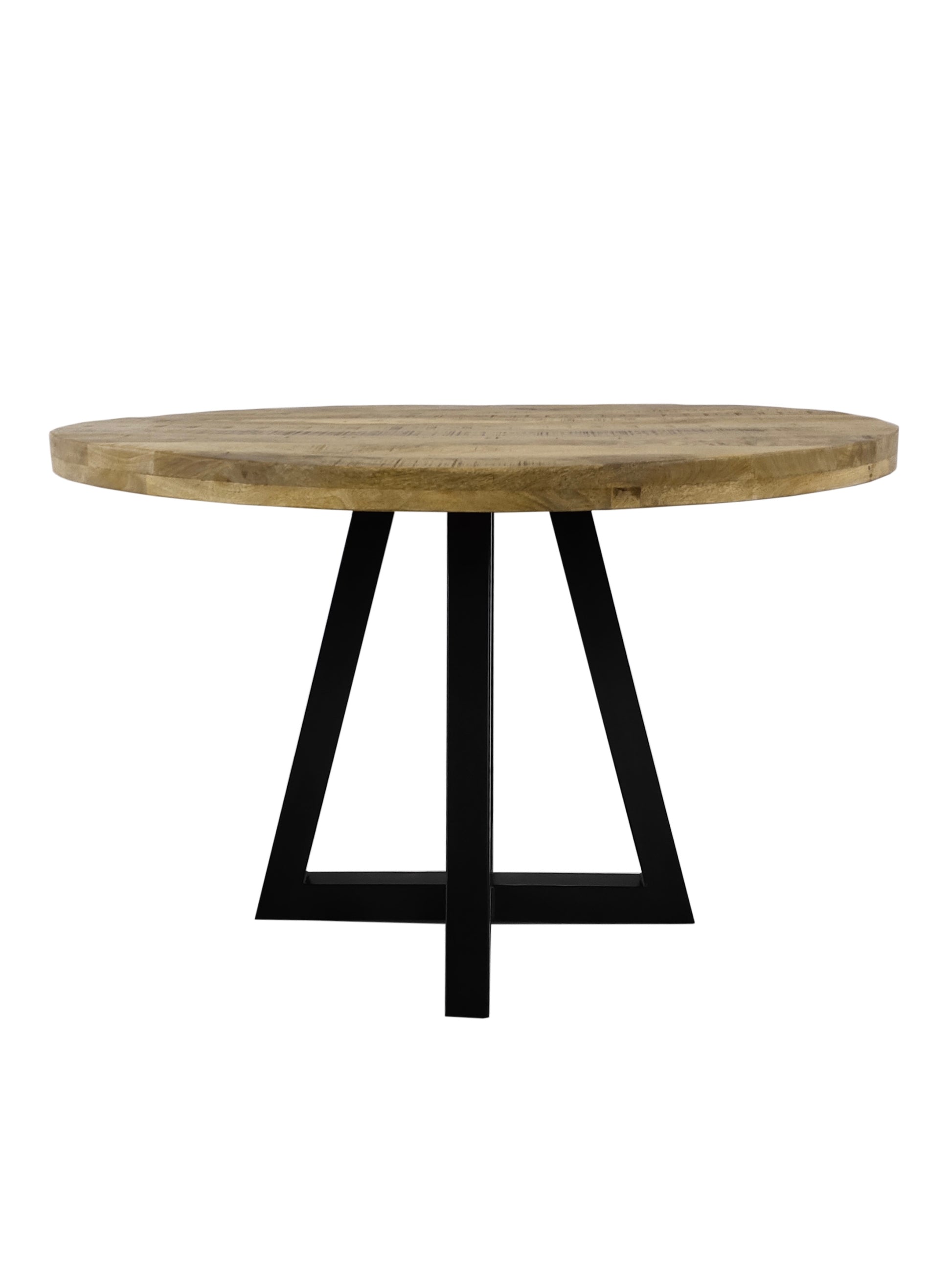 This stunning table will make a statement in any modern industrial style home. This table features a Mango tabletop on a black powder-coated modern base. Solidly built and nicely finished. Produced with sustainability in mind.
