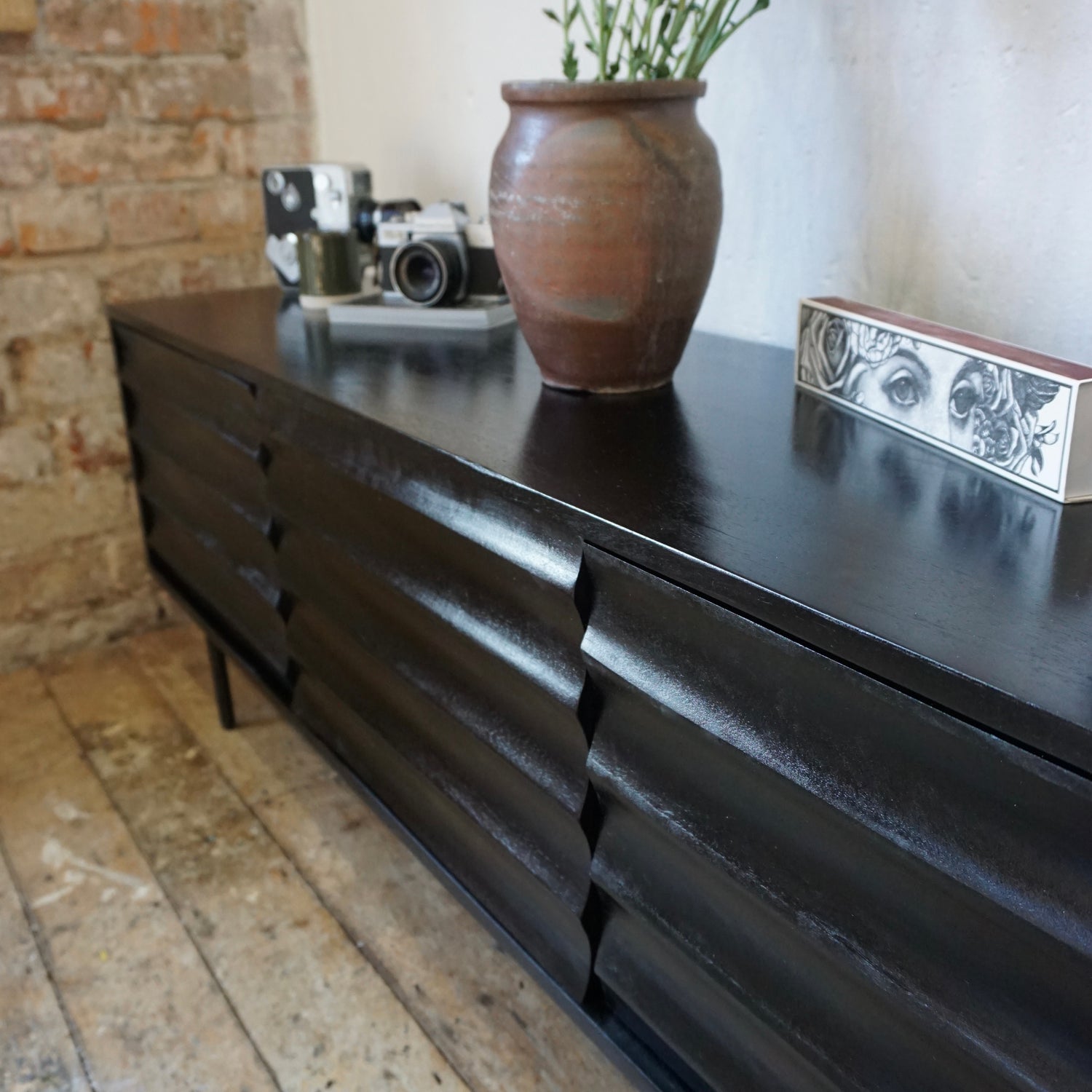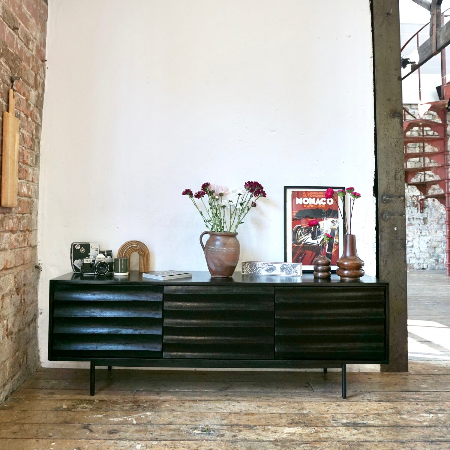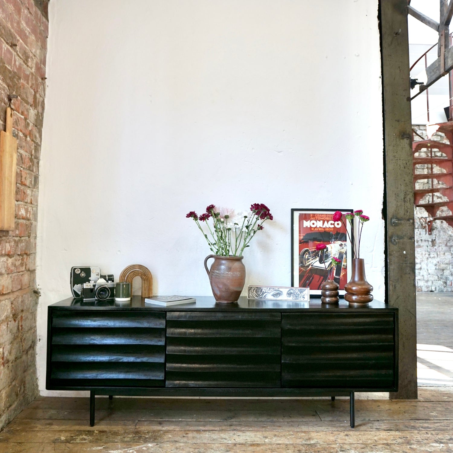 Inspired by Japandi interiors, this piece seamlessly blends Scandinavian simplicity with Japanese elegance. Crafted from solid mango wood with a black finish.