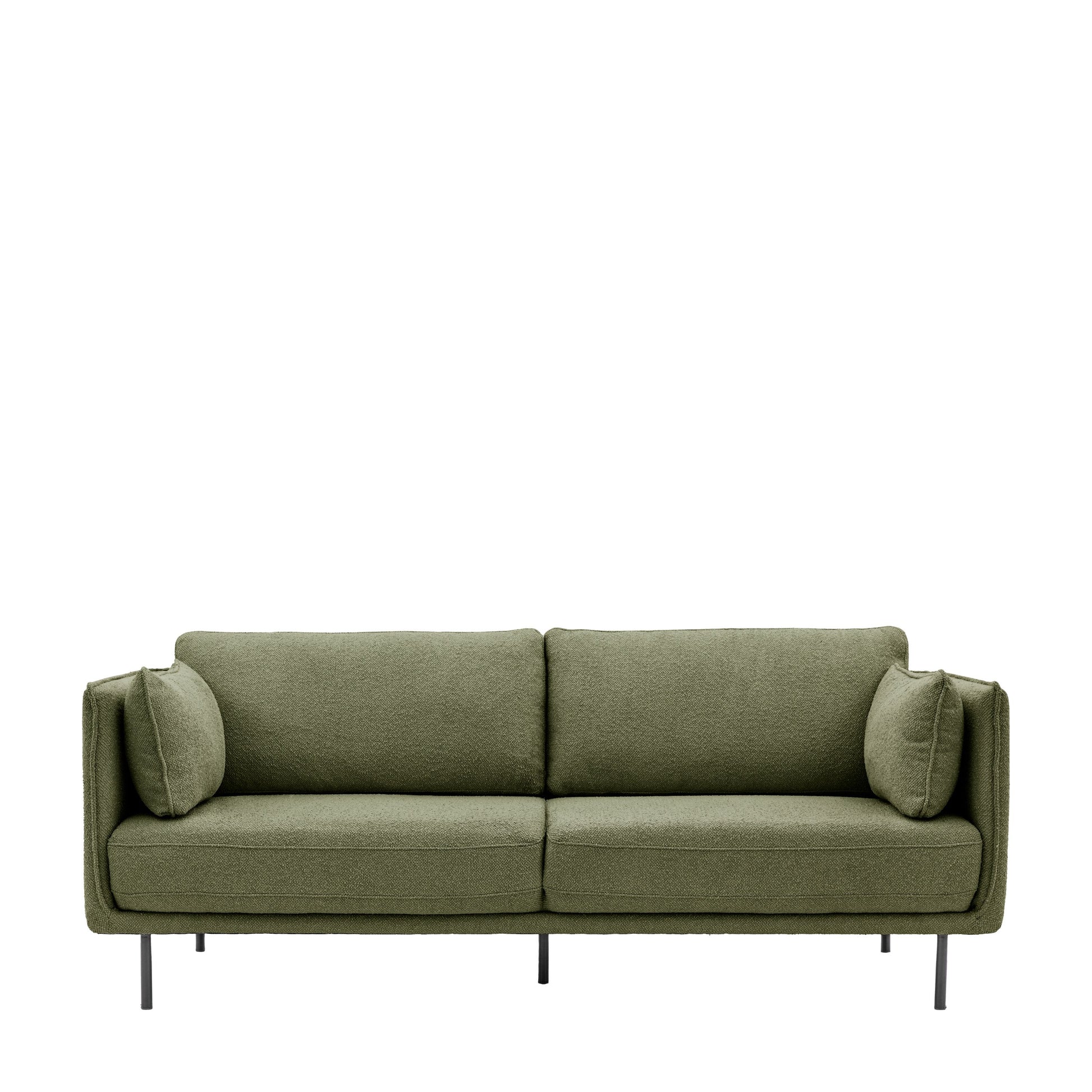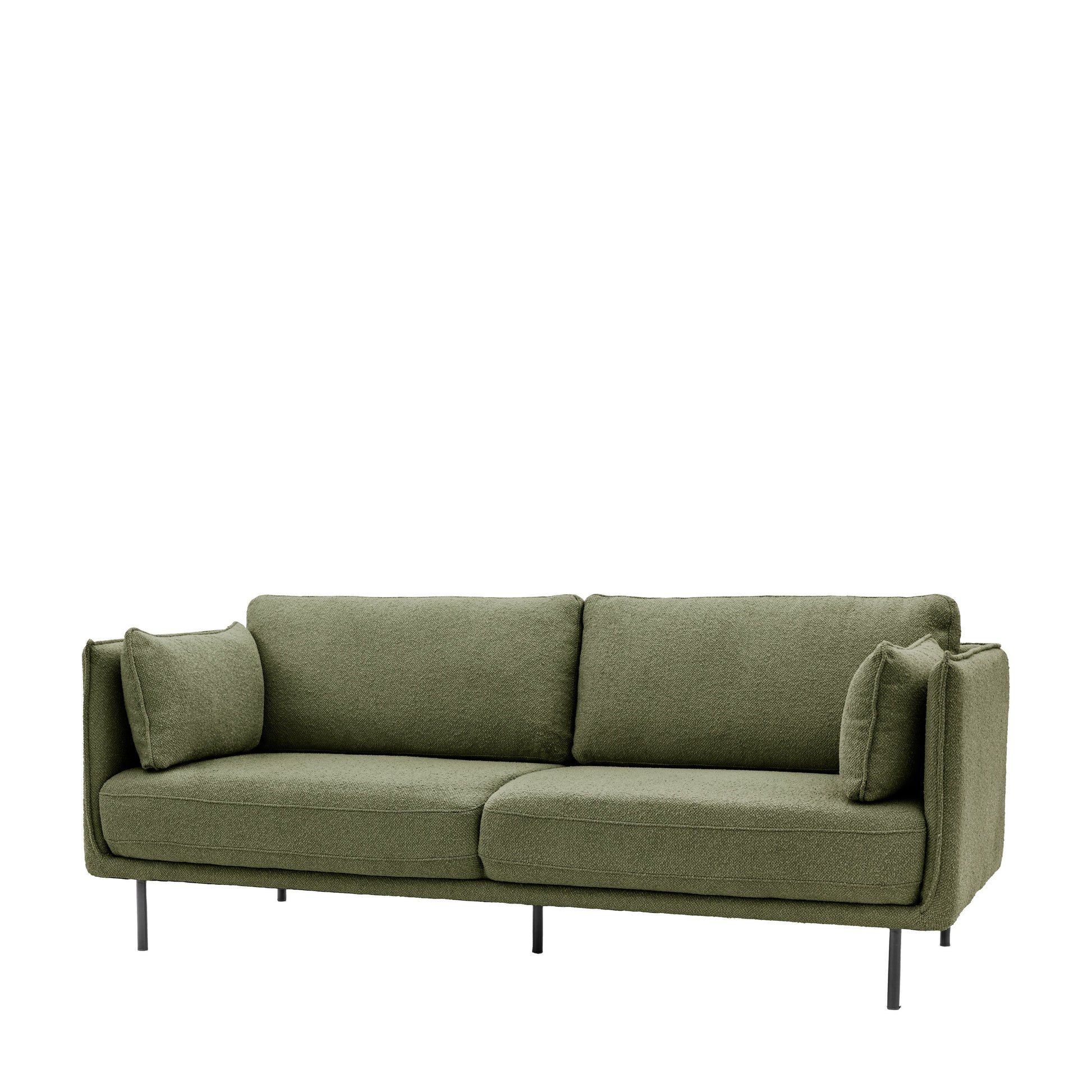 Introducing the Elijah 3 Seater Sofa in Green – a harmonious blend of modern design and plush comfort. This stylish sofa is a captivating addition to any living space, offering a sleek contemporary look that is both inviting and visually striking. Fully upholstered in a delightful green bouclé, this sofa exudes vibrancy and charm, while its black metal legs add a touch of sophistication, perfectly complementing the overall design.