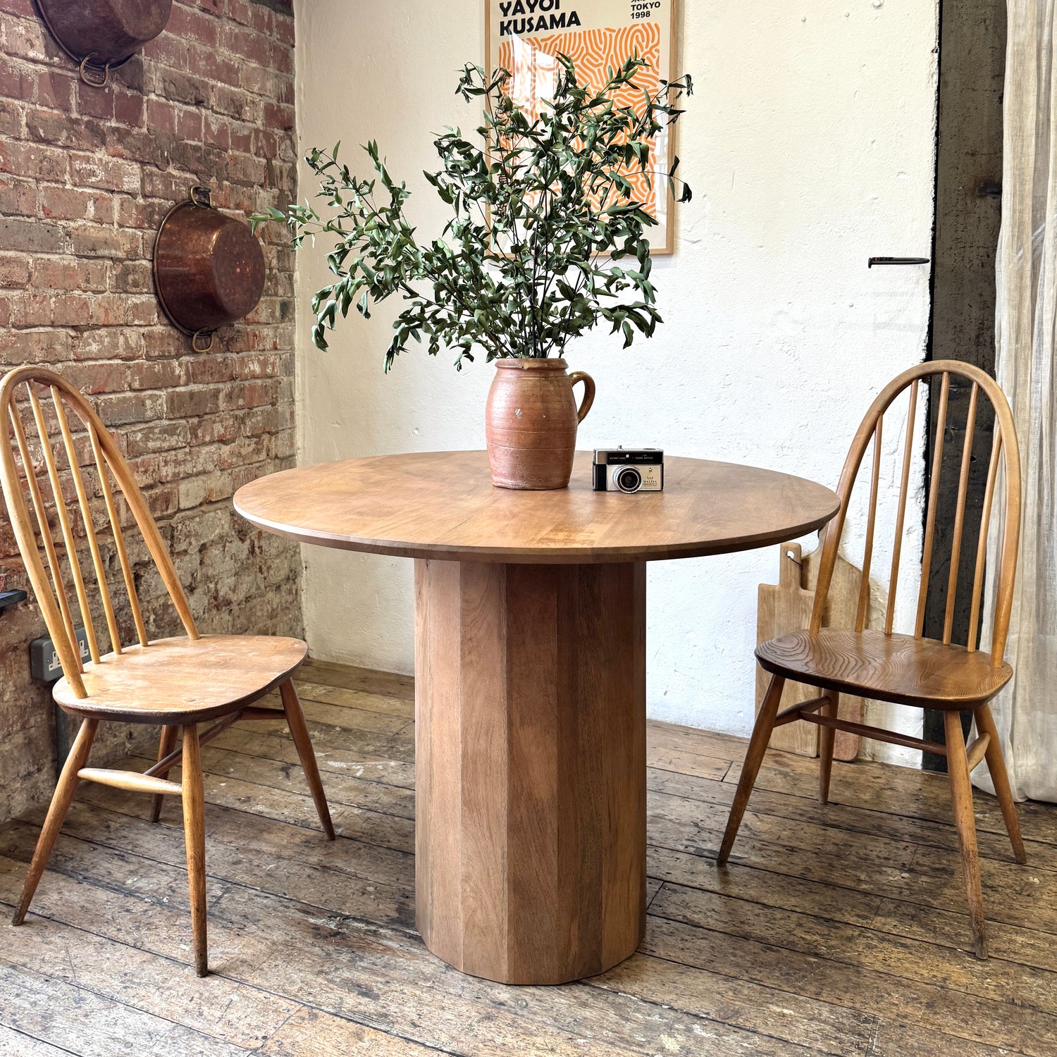 The Flora table features a unique cylindrical base constructed from multiple solid wood planks, creating a subtle geometric design that adds visual interest and charm. The tabletop is beautifully tapered with a refined bezel edge, offering a sleek and polished look that enhances its minimalist appeal.