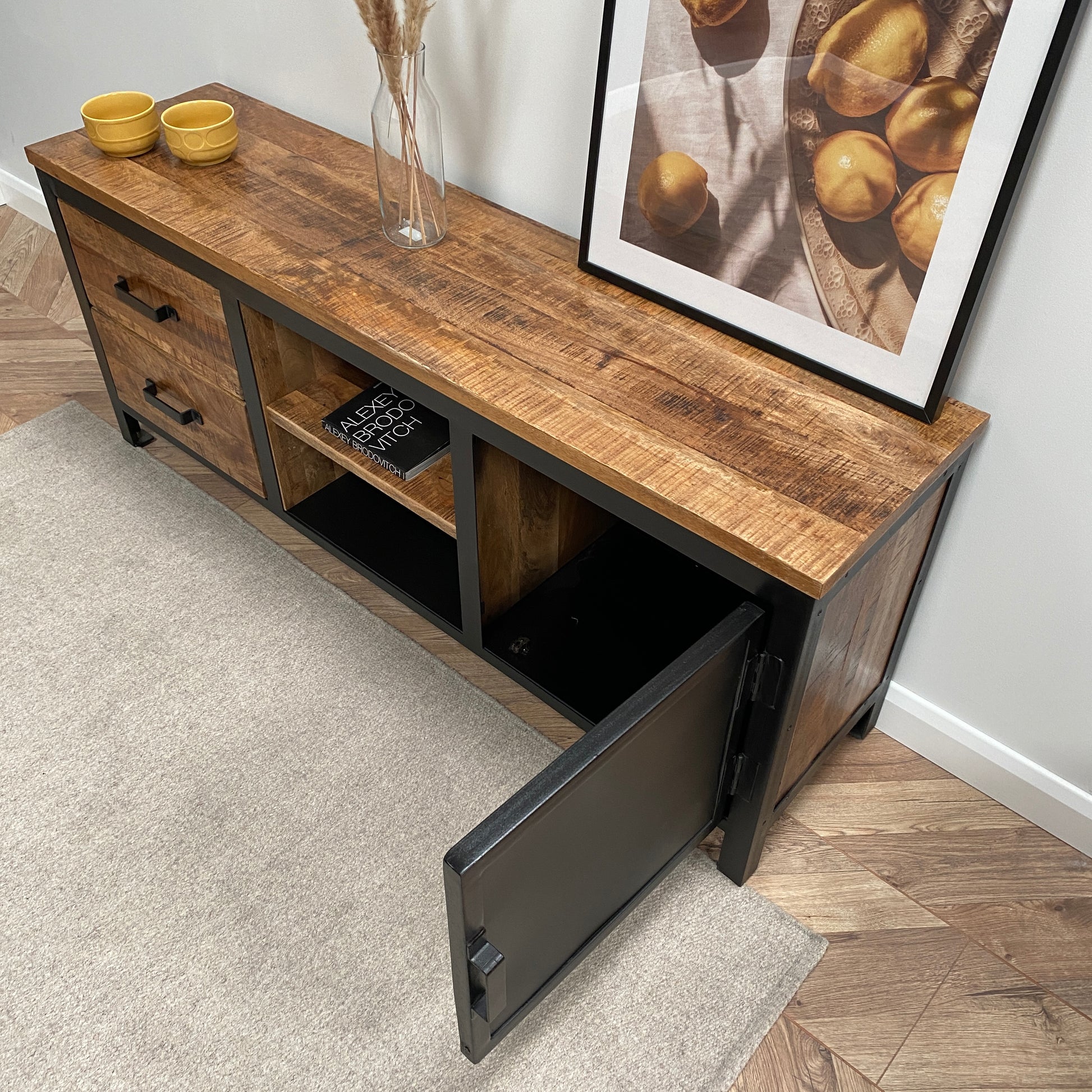 Introducing the Sara Medium TV Unit, a perfect blend of industrial style and practical design. Handcrafted from solid mango wood and iron finished in sleek black, this unit exudes a timeless charm and robust durability.