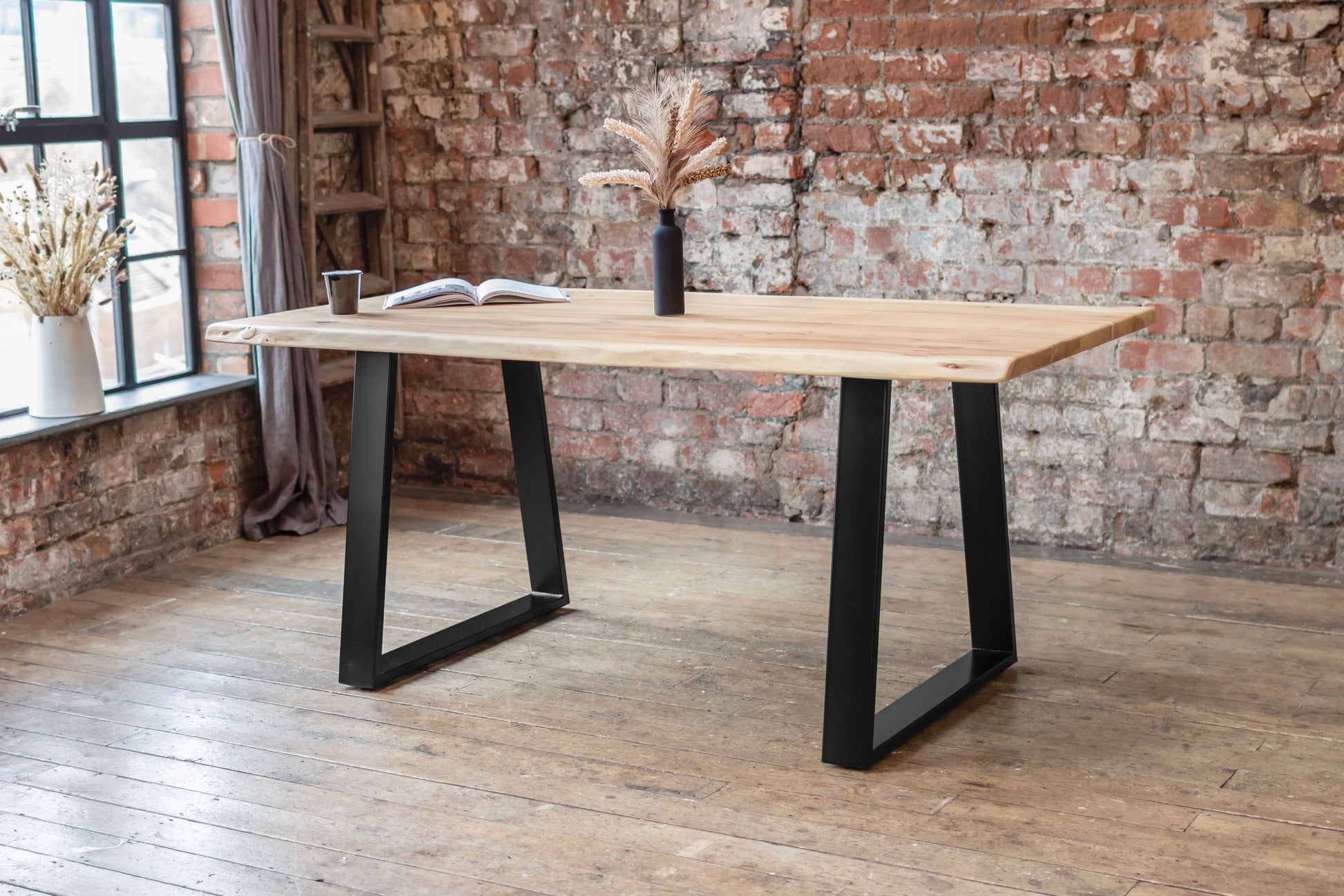 The Indiana dining table and bench set is a stunning interpretation of the modern industrial style. Featuring a live edge and black powder coated steel base. Creating a beautifully unique statement piece that will take your breath away. Perfect for any modern, loft style dining space. Because of this style, every table and bench will be unique and 1 or 1. This table is offered with a black finish or a natural stone finish.