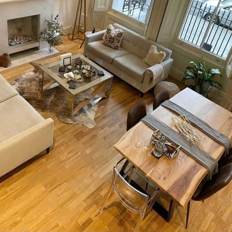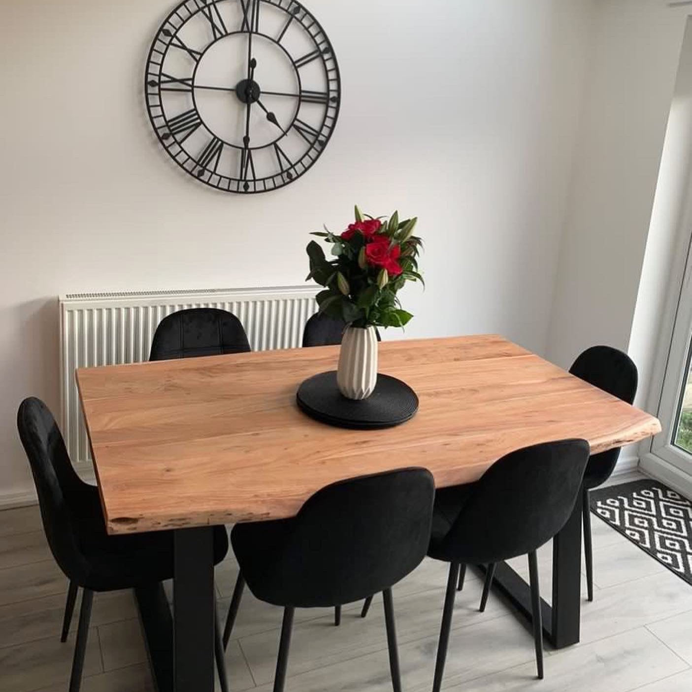 The Indiana Dining Table is a bold statement piece that beautifully blends modern industrial design with the raw elegance of nature. Crafted from solid Acacia wood, each table features a stunning live edge — a natural contour of the tree, carefully hand-finished to create a smooth, tactile surface that’s irresistibly touchable. No two are the same, making each Indiana table truly one of a kind.