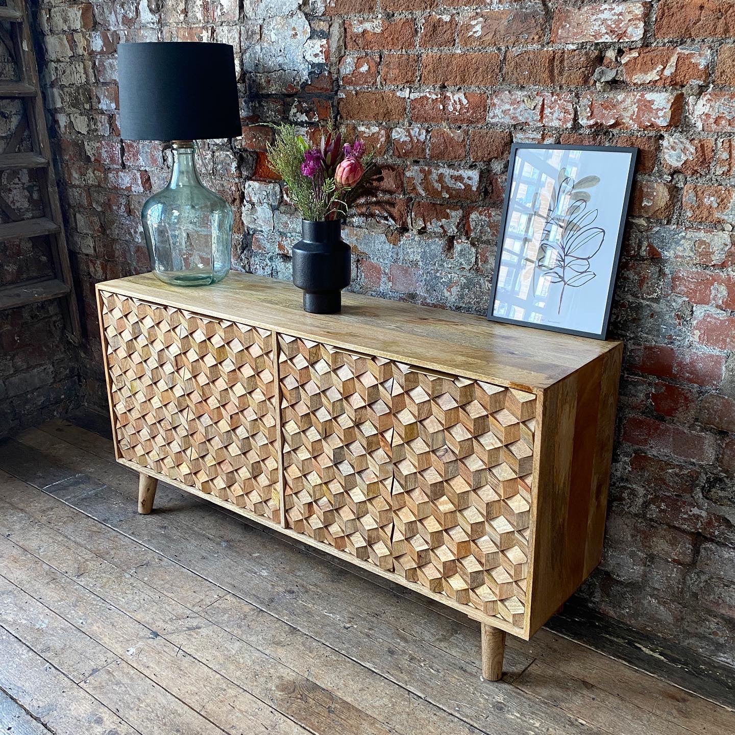 The Iona Collection. This collection is finished in a stunning natural wood. This sideboard is like a magic eye puzzle. Cubes stand out at you across the door fronts, where stunning precise tiles of solid wood lie. Now comes with a beautiful, elegant handle at the top of the doors, finished in brass.