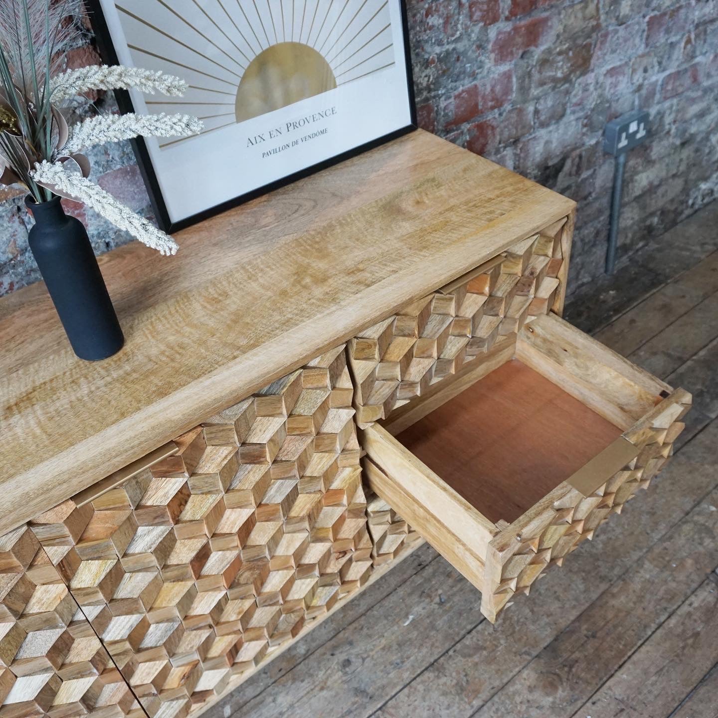 The Iona Collection. This collection is finished in a stunning natural wood. This sideboard is like a magic eye puzzle. Cubes stand out at you across the door fronts, where stunning precise tiles of solid wood lie. Now comes with a beautiful, elegant handle at the top of the doors, finished in brass.