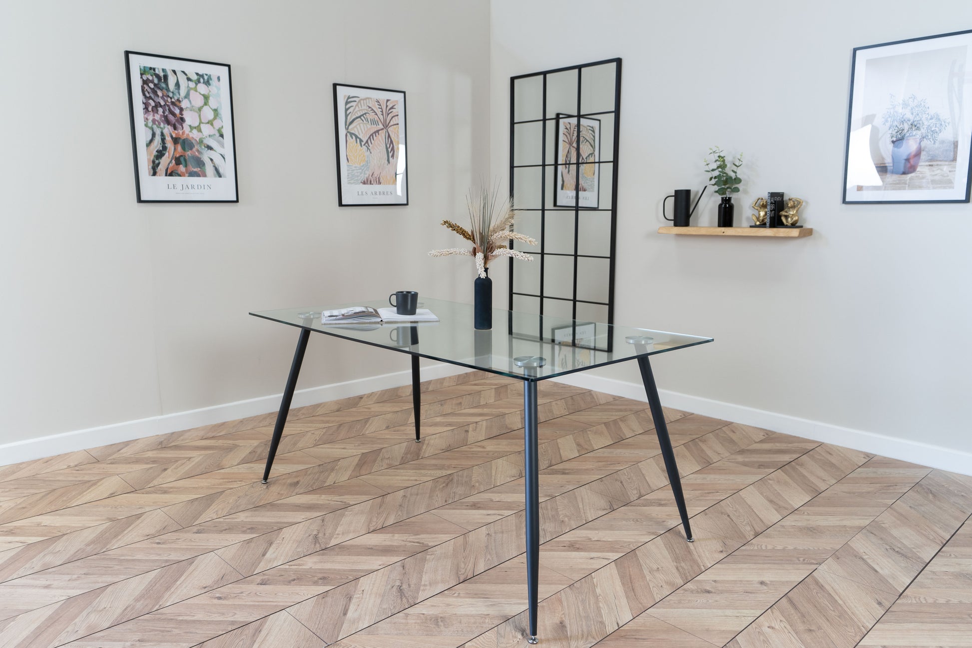 The wonderful Isla Dining table. This table features a 10mm tempered glass top and matt black legs to give an elegant, lustrous setting for everyday dining and entertaining. This beautiful dining table set comes with 4 or 6 Portia dining chairs in black.