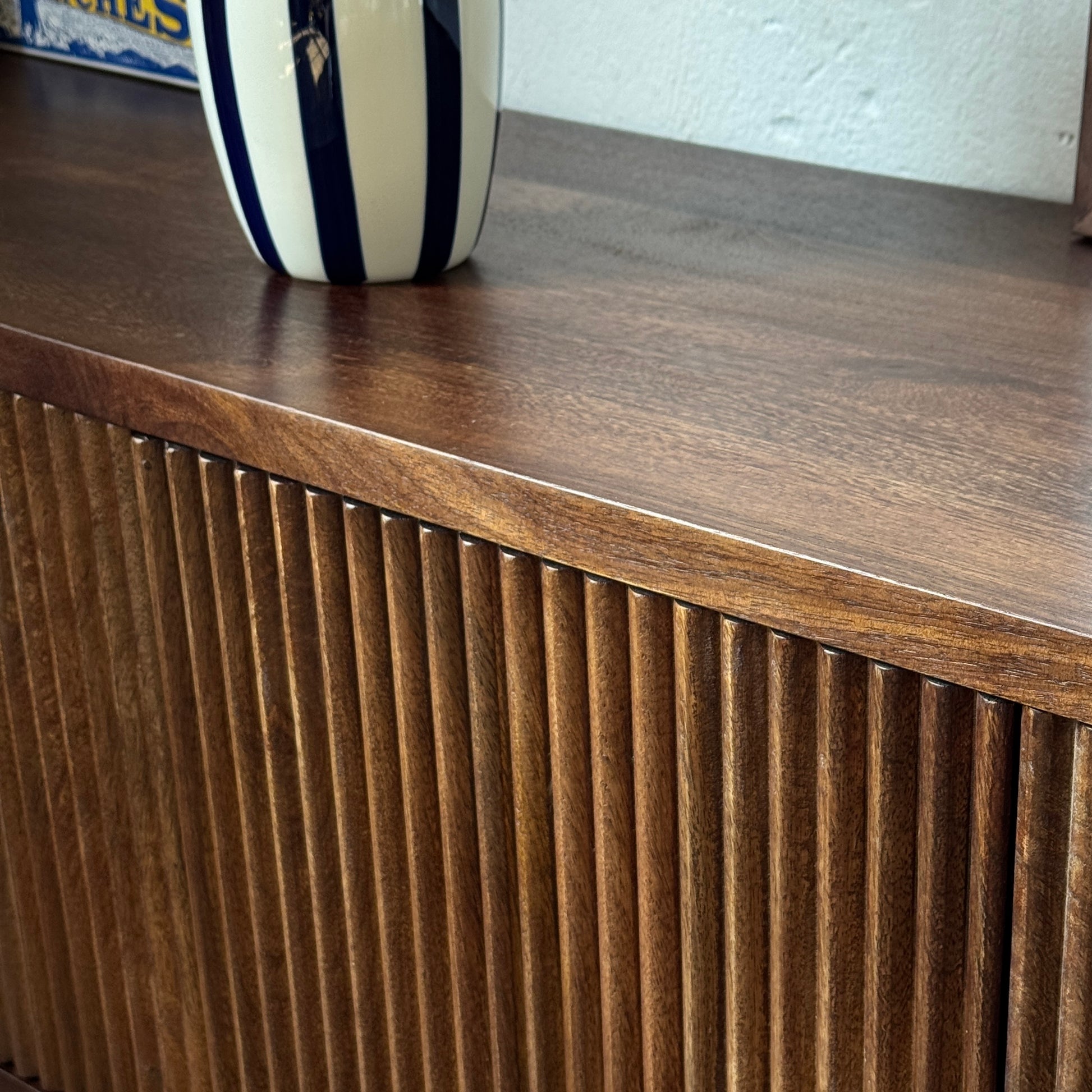 The design is defined by its clean lines and textured ribbed door fronts, adding a touch of visual depth without overpowering the space. This subtle detailing makes it as much a design statement as it is a practical solution for media storage.