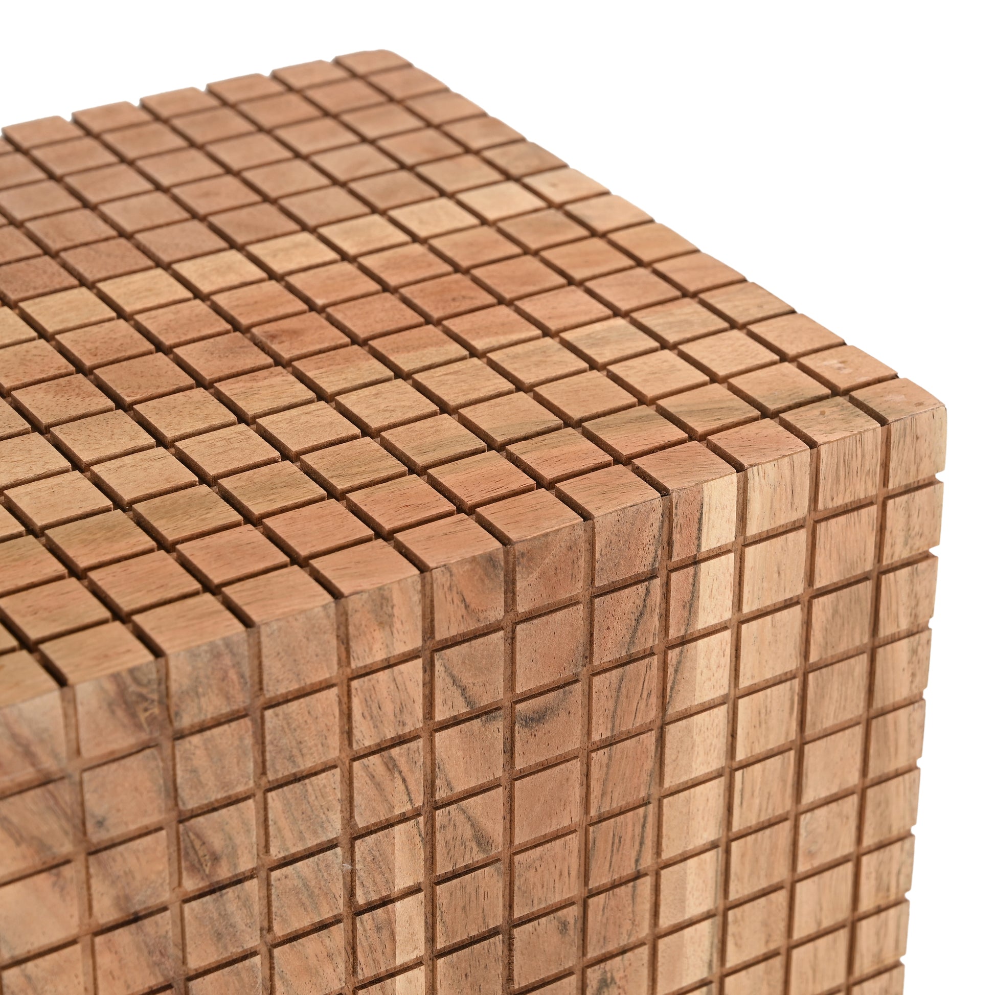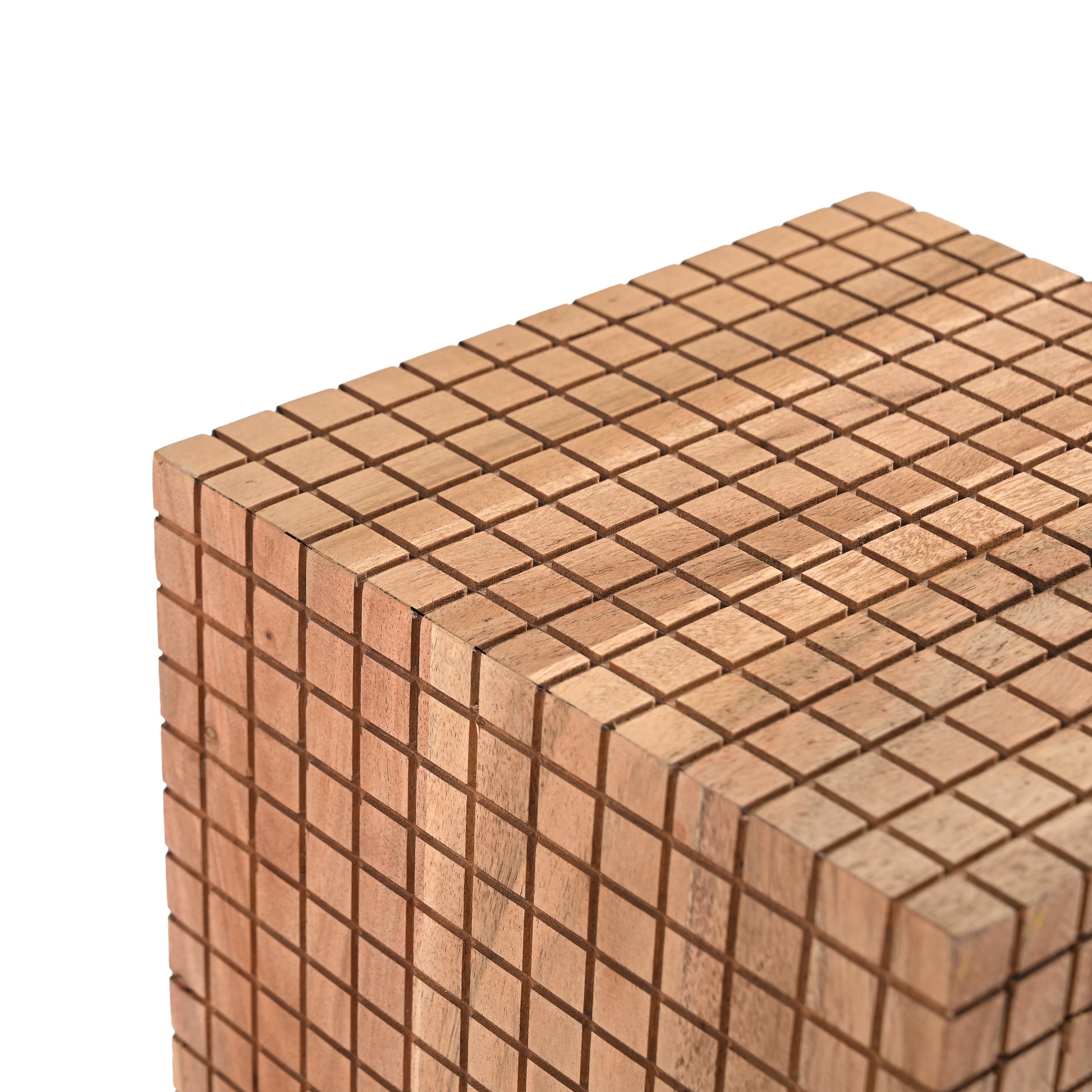 The Jiro Side Table brings sculptural charm and artisanal detail to any space. Crafted entirely from solid acacia wood, this striking piece showcases a grid-like engraved pattern that wraps around its surface, finished with delicate hand-painted detailing to highlight its natural beauty.