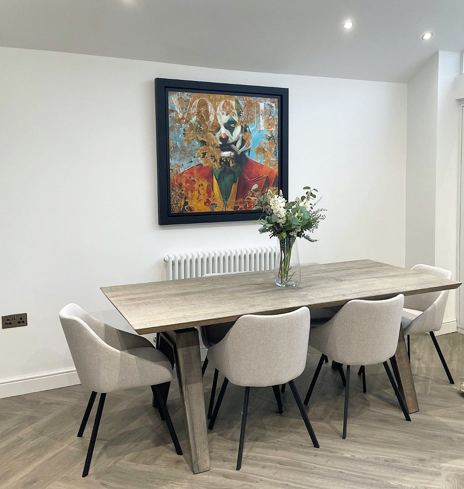 The stunning Julia scoop style dining chair is a stunning, on trend, elegant design. The combination of the padding, fabric and thick side bolstering provides an exceptionally comfortable dining experience. It's luxurious scoop style backrest and black metal legs will make a statement in all modern dining spaces. This chair is finished in a stunning stone upholstered fabric. 2 x Julia dining chairs come with this set.