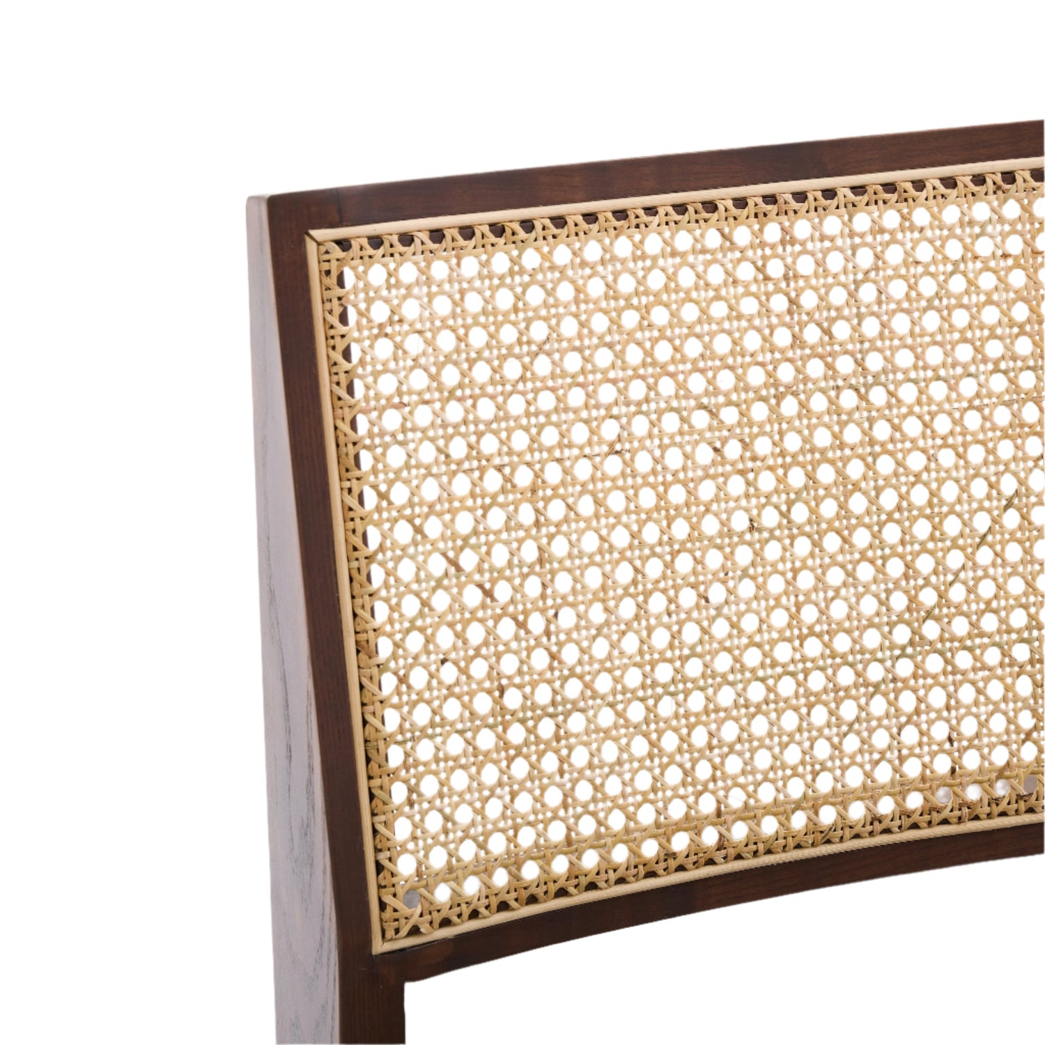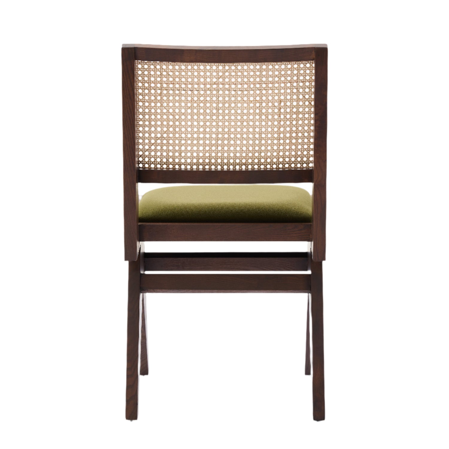 Crafted with exceptional attention to detail, the Kiko dining chair combines elegance and comfort in a timeless design. Finished in a rich walnut colour, each chair showcases the natural beauty of high-quality ash wood, hand-finished to perfection. The chair features an olive green velvet seat pad, adding a touch of luxury, and a natural rattan backrest, providing both comfort and an organic texture that complements the warm wood tones.