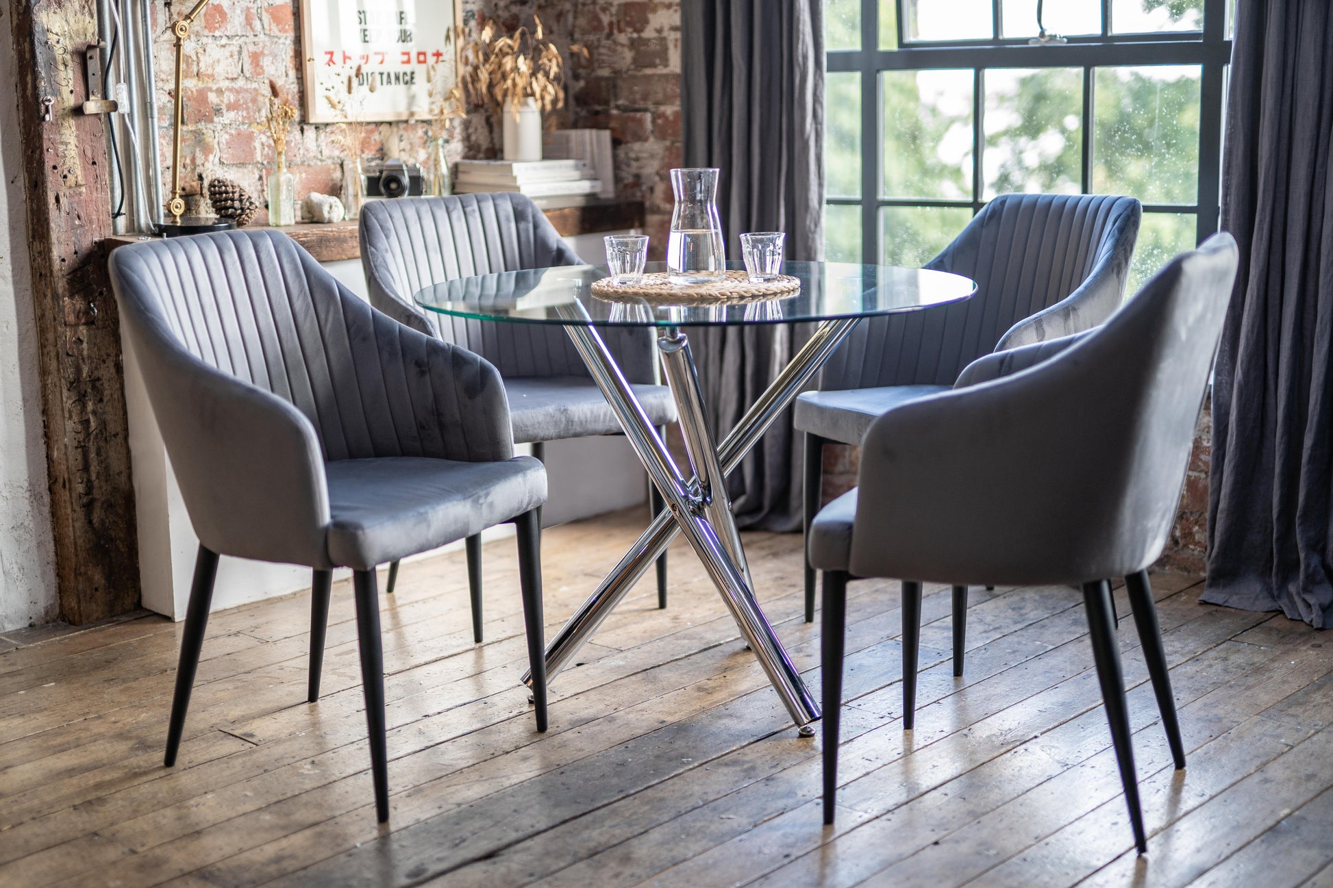 The truly stunning Maia dining table features an elegantly styled base finished in chrome. This Japanese inspired base is topped with a substantially tempered glass top to create an exquisite contemporary piece that will take your breath away. This set comes with 4 beautiful Aria dining chairs. Hand crafted luxury dining chair, finished in a luscious grey velvet. This chair features line stitching, comfortable side bolstering and black legs.