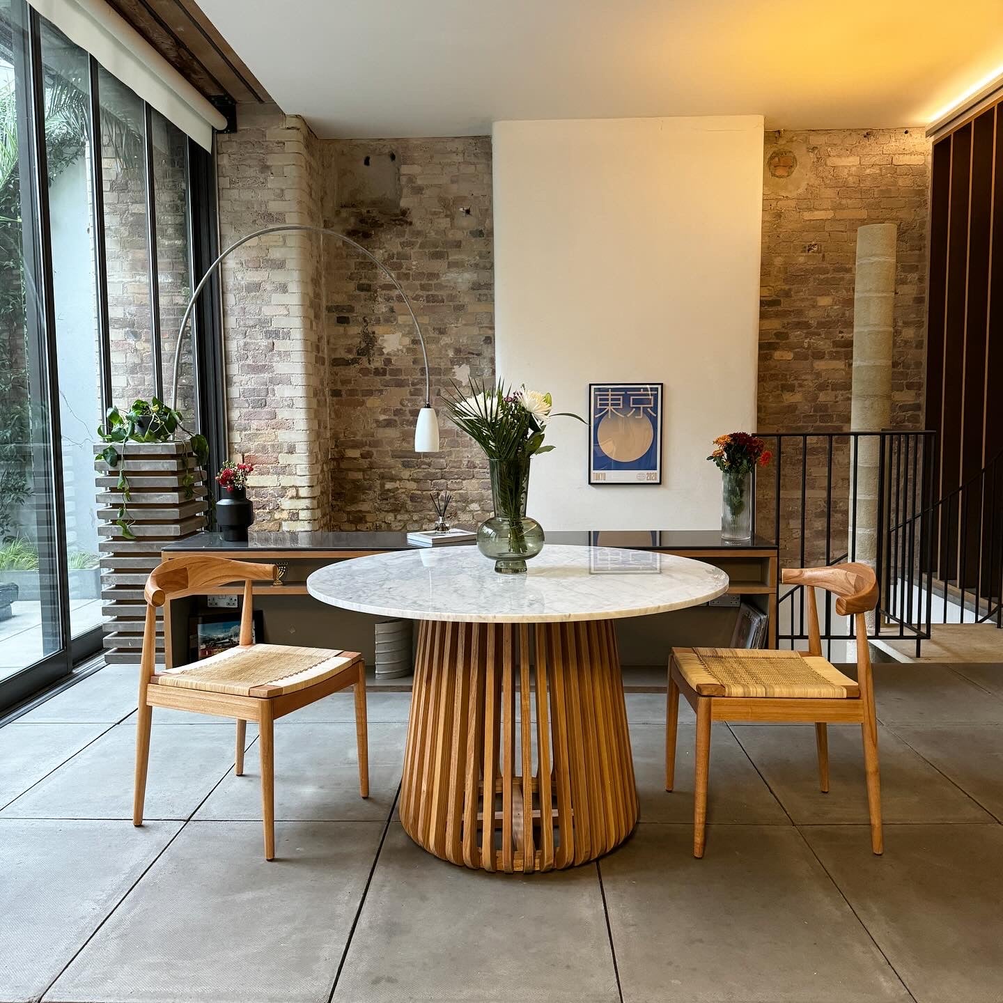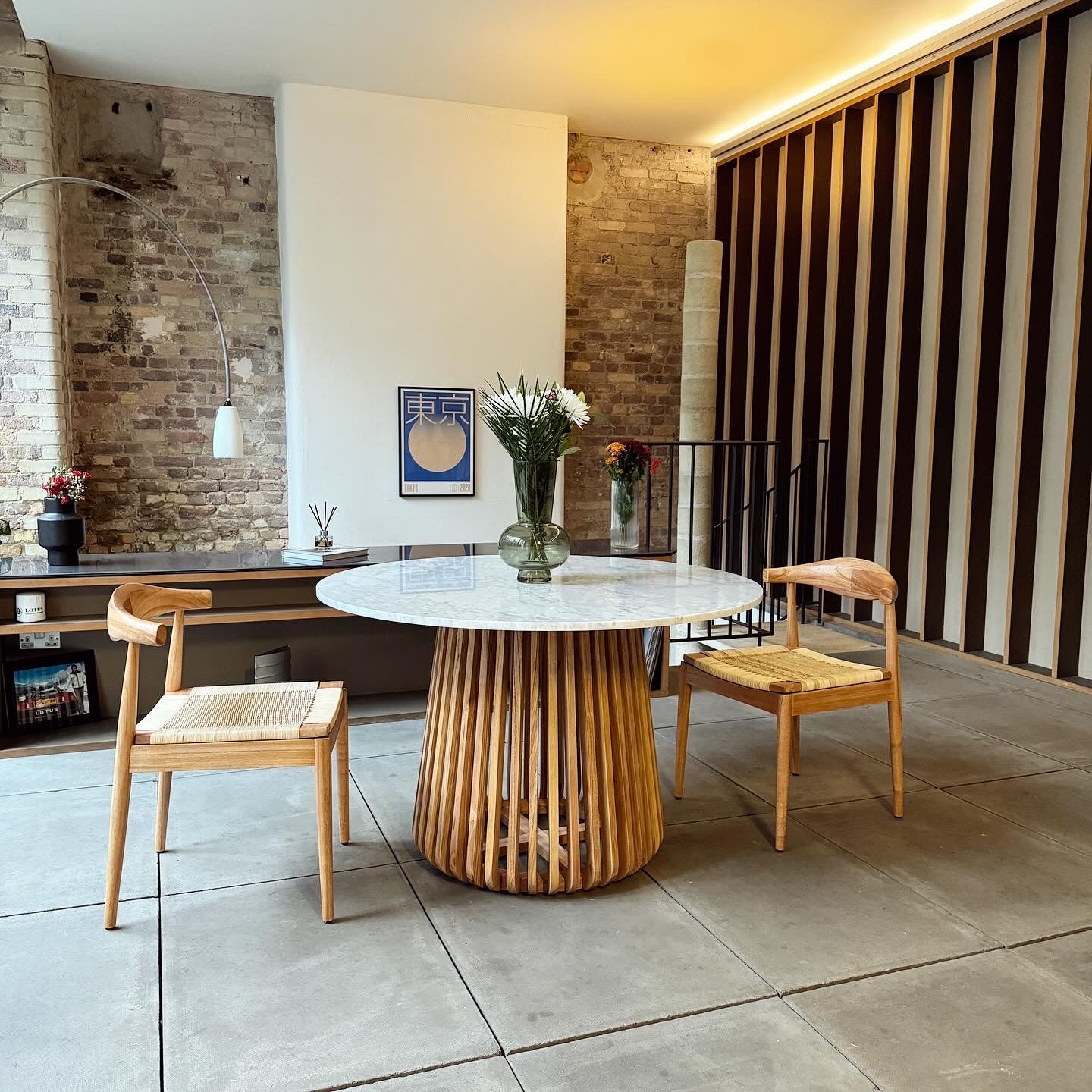 The focal point of this table is its mesmerising slatted pedestal base, expertly handcrafted from the finest Mango wood finished in natural. Mango wood is renowned for its durability and distinctive grain patterns, and this base showcases its natural beauty with an elegant twist. The slatted design adds an element of sophistication to the overall aesthetic.