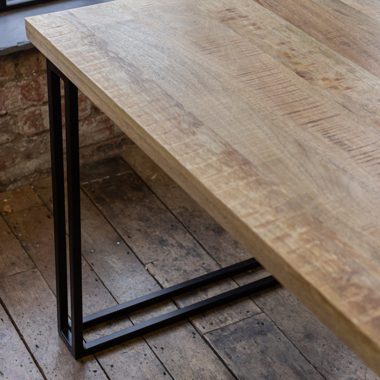 At the heart of this exceptional piece lies a Mango wood tabletop, exuding natural beauty and character. Its 40mm thickness adds a sense of solidity and durability, ensuring years of enjoyment. Supported by a sleek black powder-coated modern base, this table strikes the perfect balance between rustic appeal and contemporary elegance.