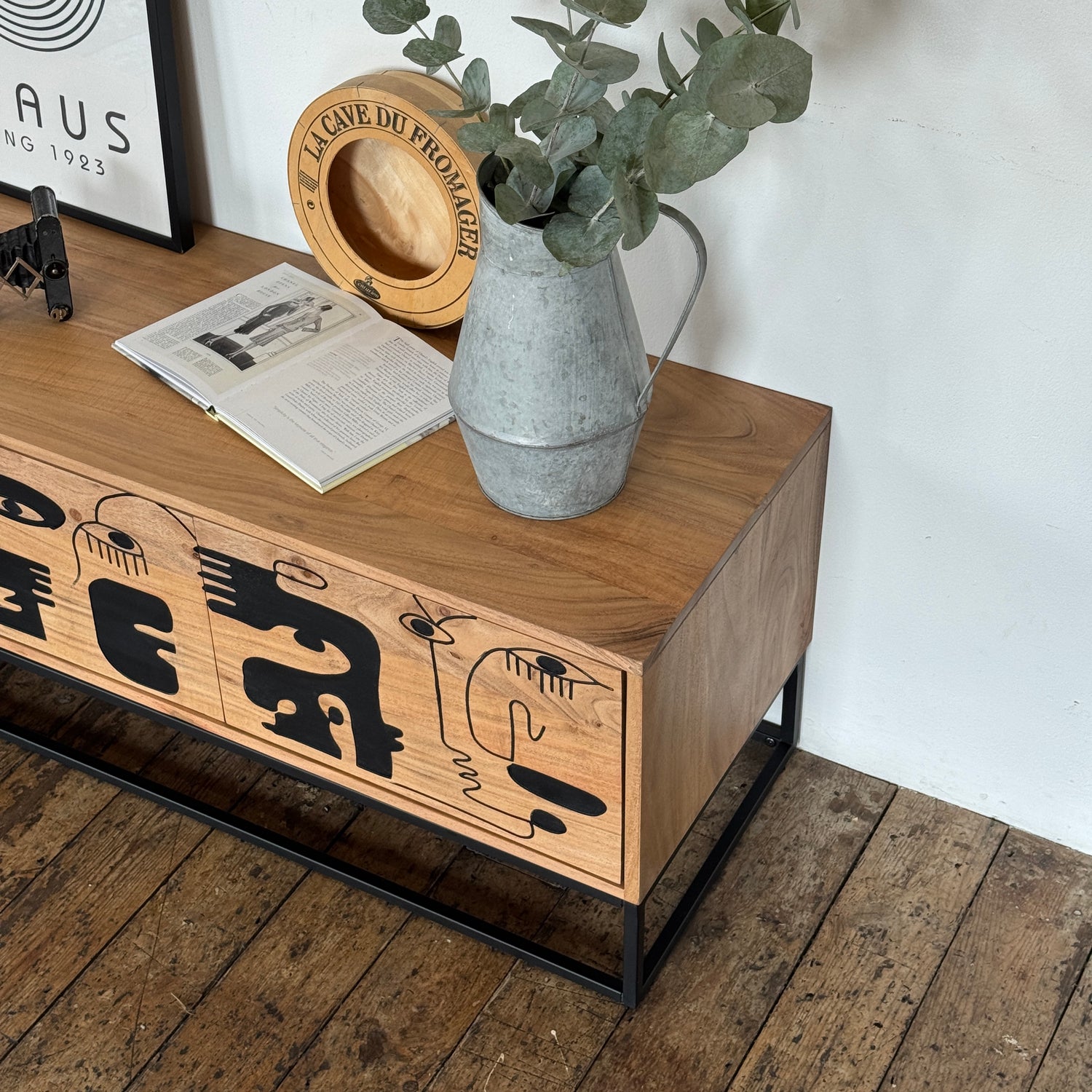 Finished in a natural teak colour, the rich, warm tones of the acacia wood create an inviting ambiance. The standout feature of the Pablo TV unit is the Picasso-inspired artwork embedded on the three doors. This intricate design, painted in striking black, transforms the TV unit into a captivating piece of art, making it a focal point in your home.