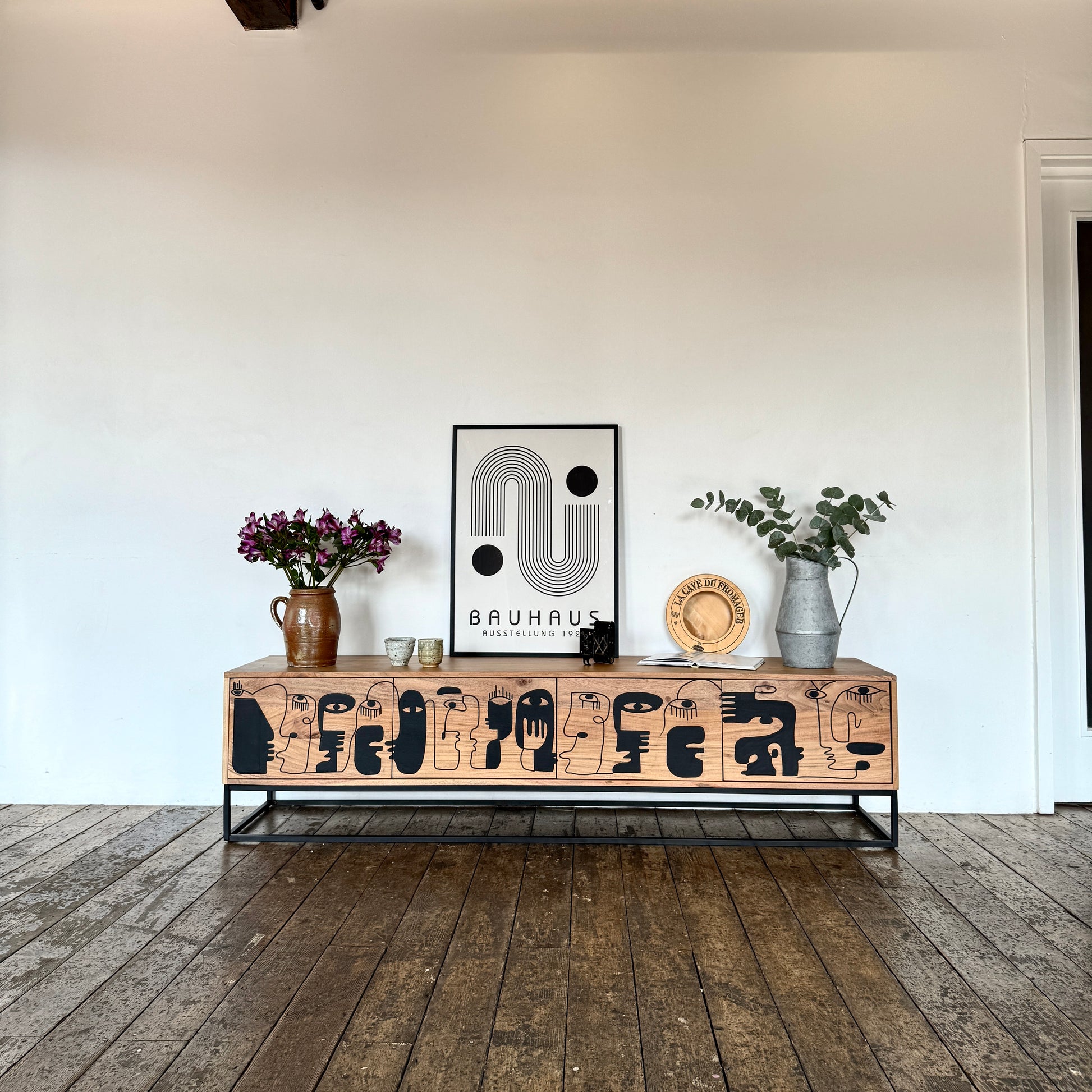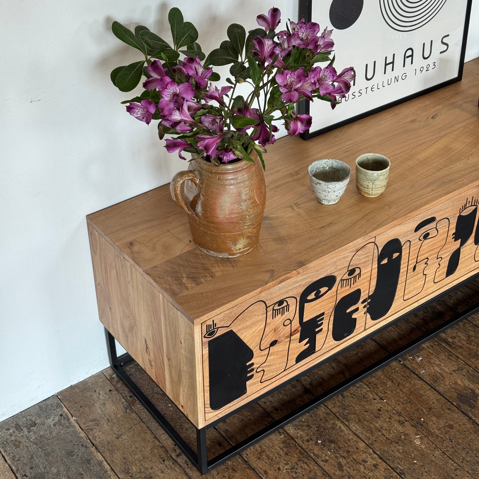 Finished in a natural teak colour, the rich, warm tones of the acacia wood create an inviting ambiance. The standout feature of the Pablo TV unit is the Picasso-inspired artwork embedded on the three doors. This intricate design, painted in striking black, transforms the TV unit into a captivating piece of art, making it a focal point in your home.