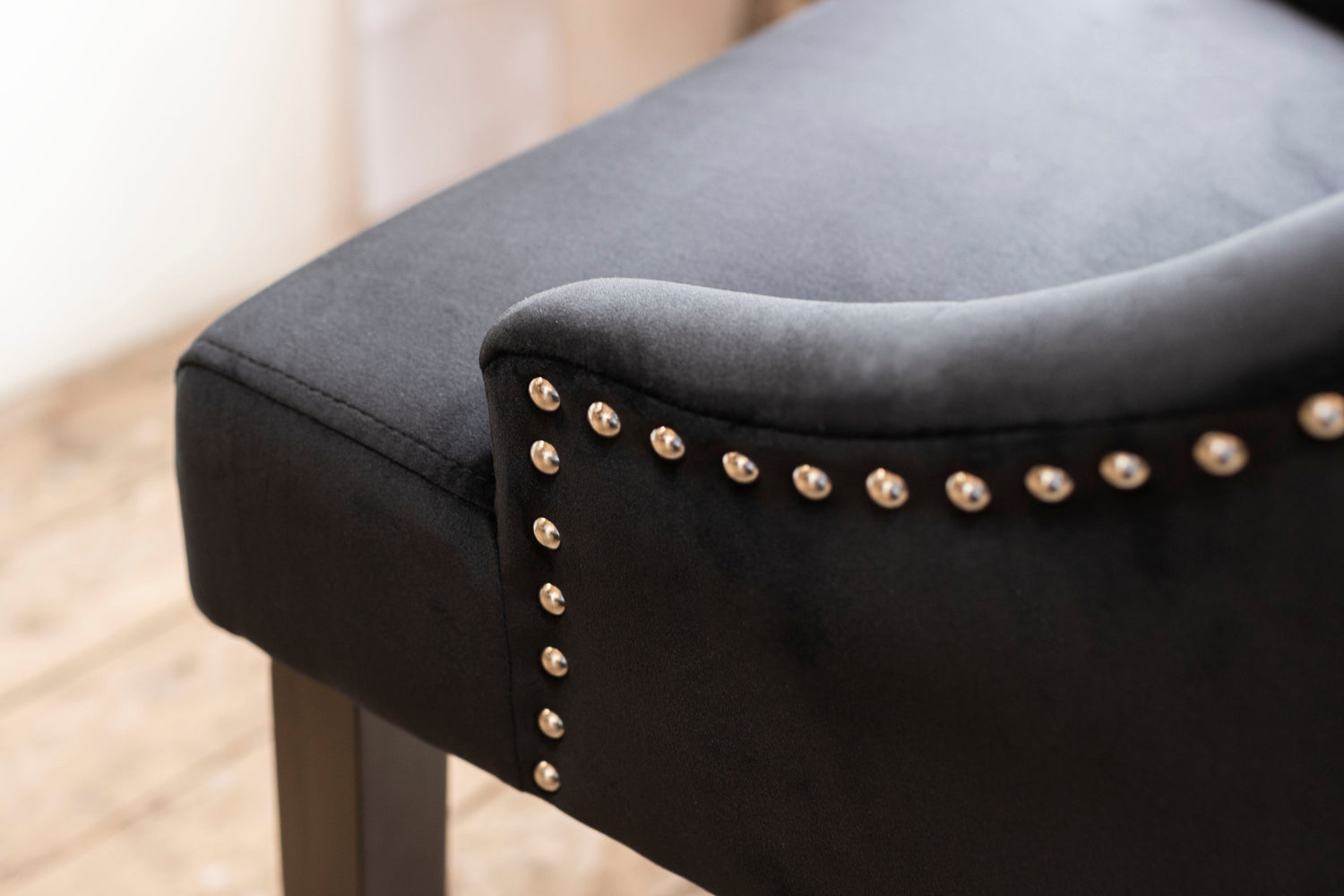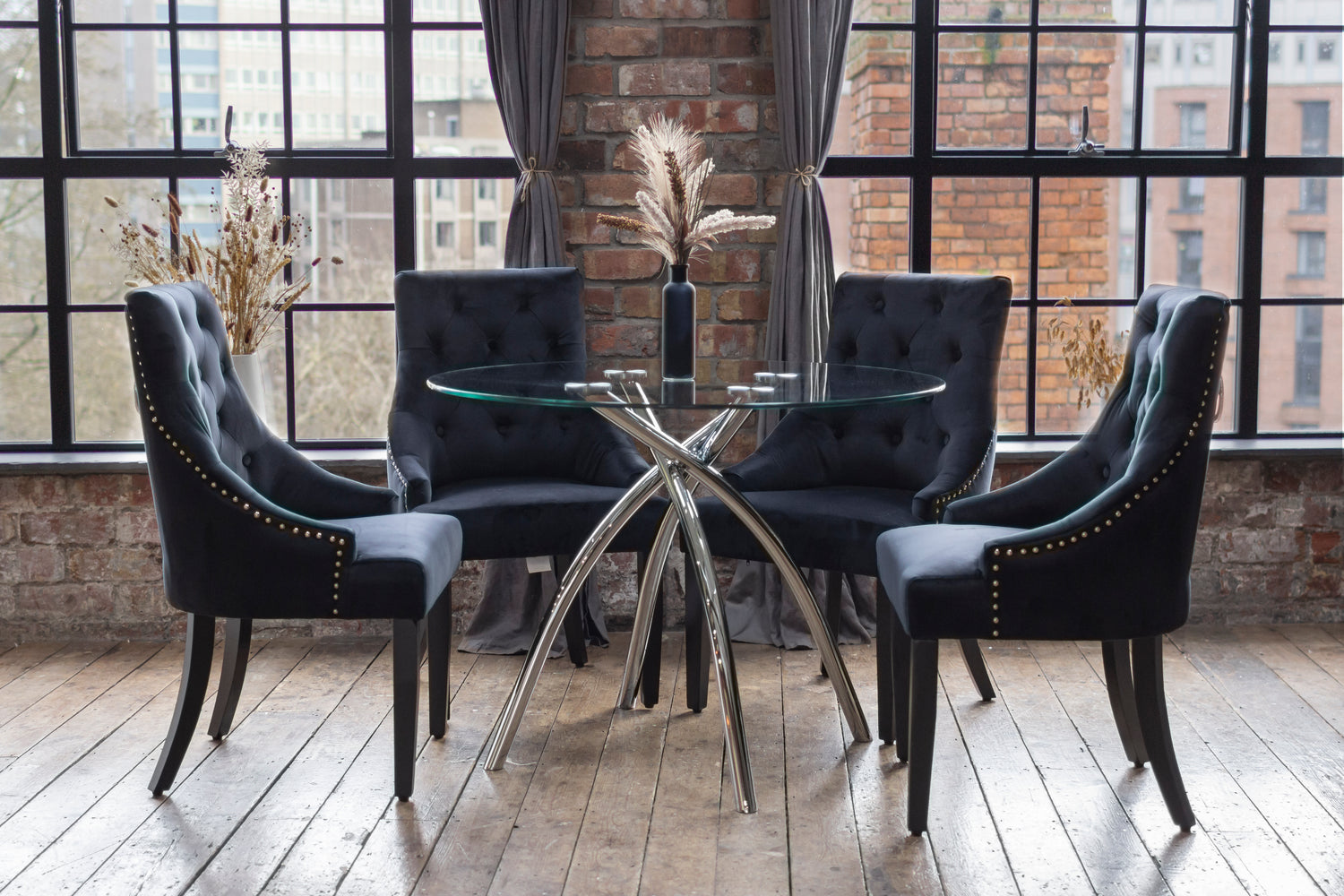 Our world famous Portia French scoop style dining chairs are known around the world, and for good reason. This stunning chair features chrome lined studs, a chrome handle at the rear with black wooden legs finished in our very own luxurious black velvet. This chair is exceptionally sturdy and is finished to the highest standard. The finish of velvet looks luxurious, beautiful and expensive. 2 x Portia dining chairs come with this set.