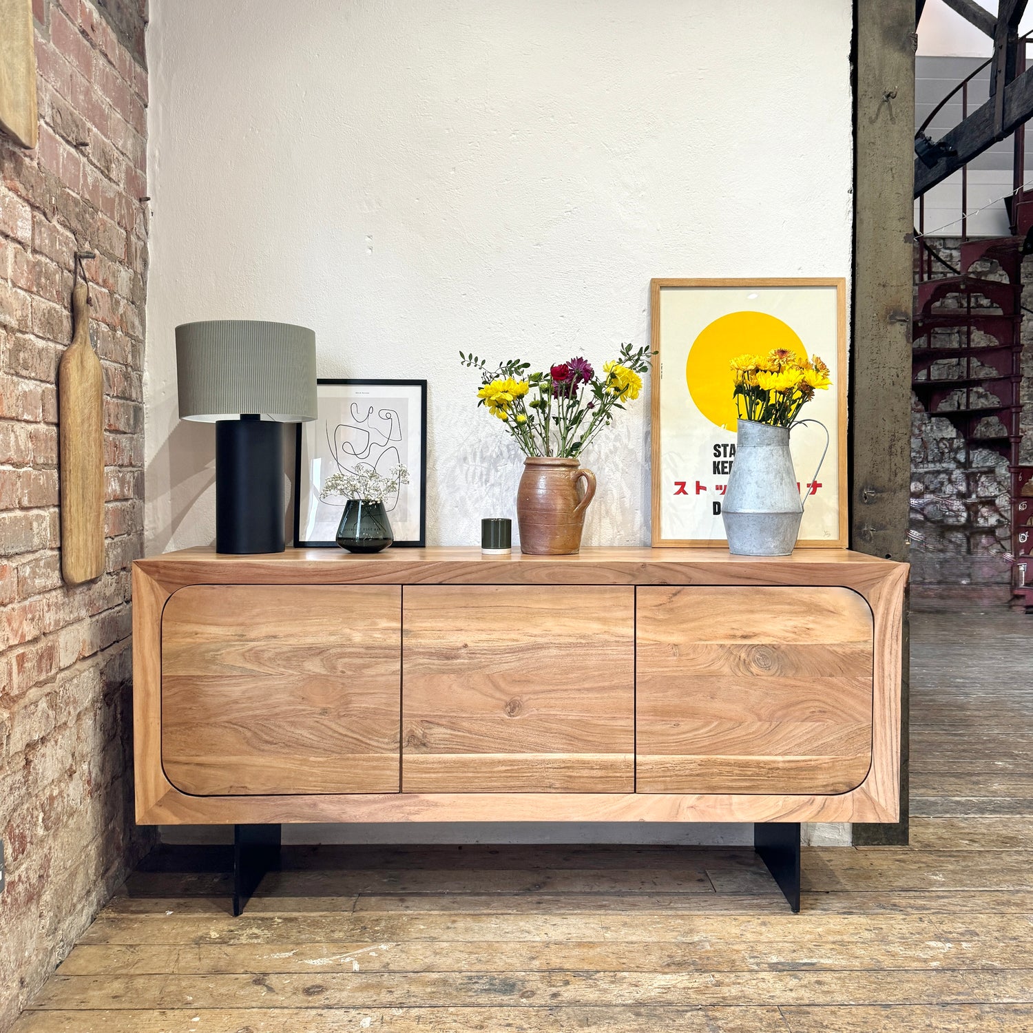 Introducing the Primo Sideboard, a masterful blend of Scandinavian minimalism and industrial chic. Crafted from solid acacia wood, this sideboard is finished in a rich natural teak colour that highlights the wood's intrinsic beauty. Its design is defined by clean, simple lines that embody the essence of Scandinavian style, while the subtle steel legs add a touch of industrial edge.
