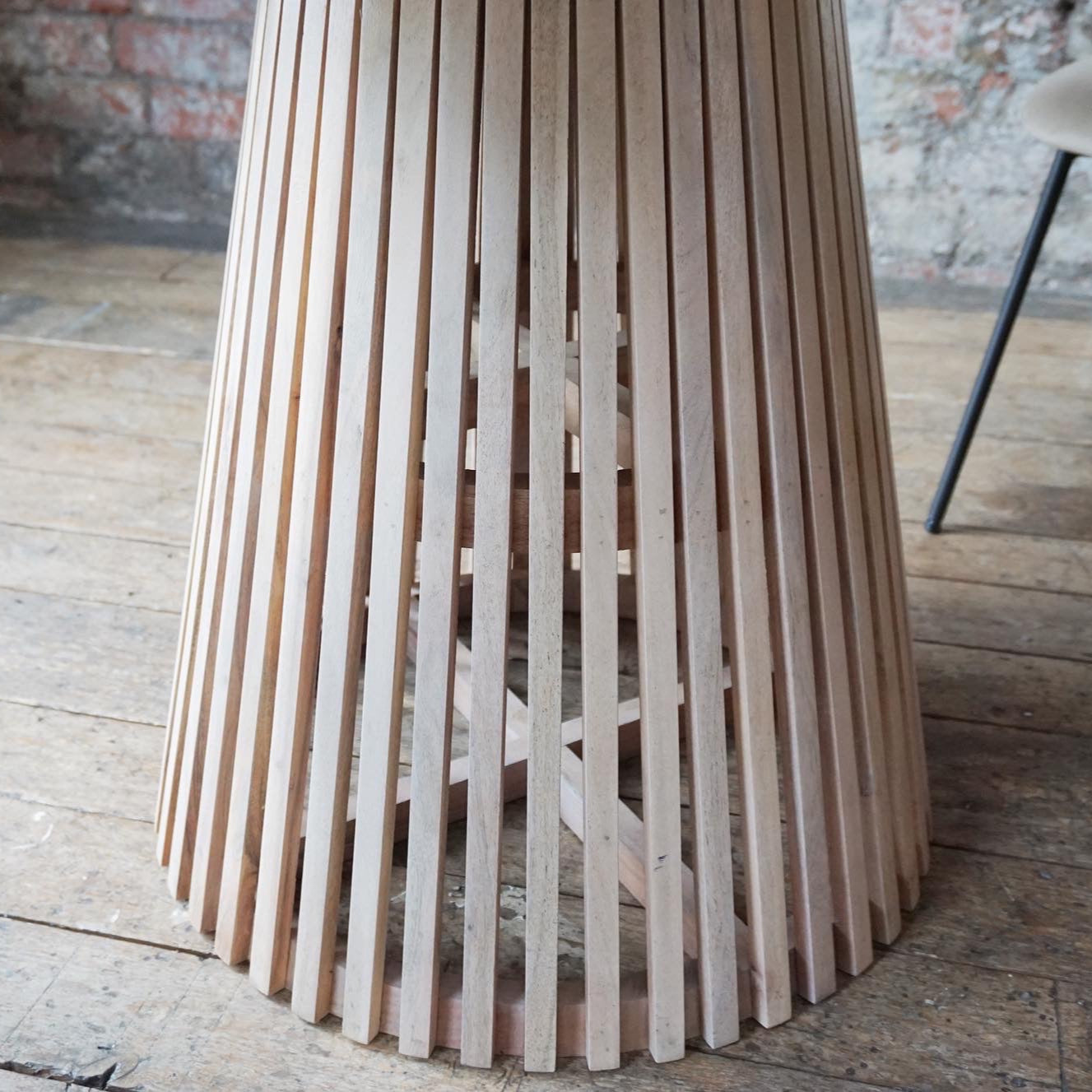 Add a touch of understated elegance to your home with our Scandinavian-inspired dining table, expertly crafted from sustainable mango wood and finished in a soft whitewash. The pedestal-style base features beautifully crafted vertical slats, providing a sculptural design with exceptional stability.