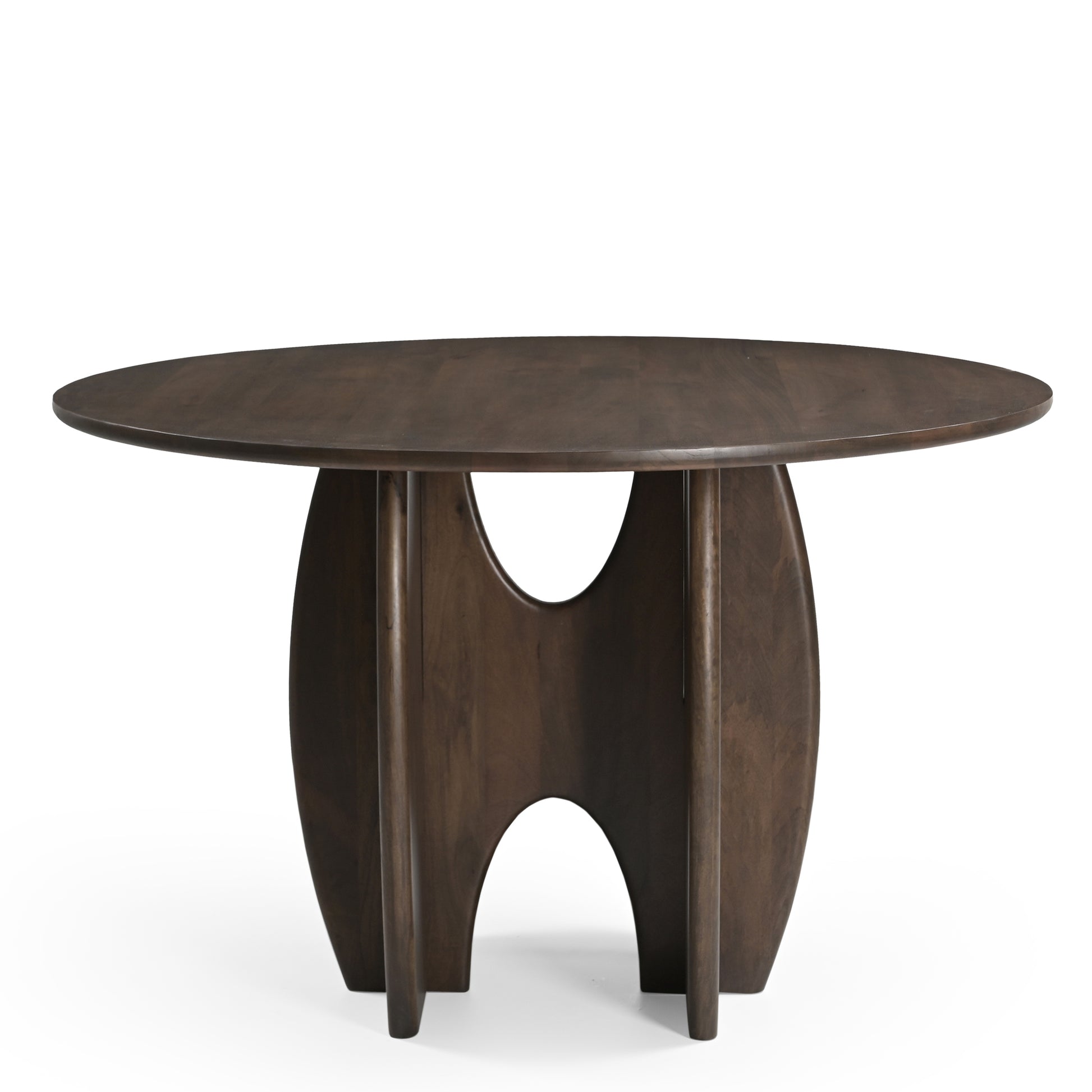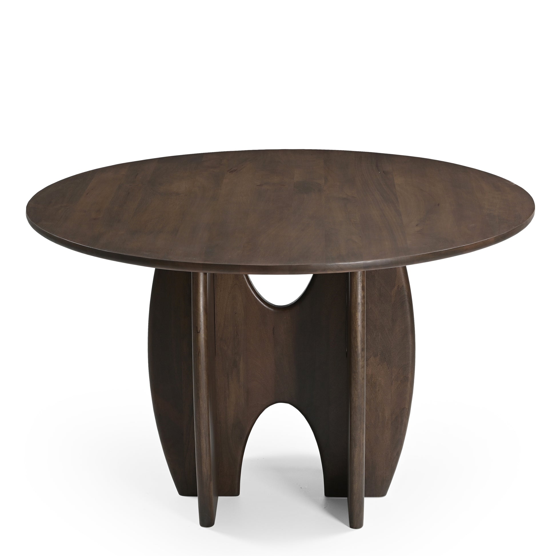 Introducing the Rina Round Solid Mango Wood Dining Table, a true statement piece for any dining space. Handcrafted with care from solid mango wood, this artistic dining table features a unique, puzzle-like base that slots seamlessly over the top of another piece, creating an intriguing and sculptural design. The round tabletop is finished in a rich brown hue, enhancing the natural beauty and grain of the mango wood.