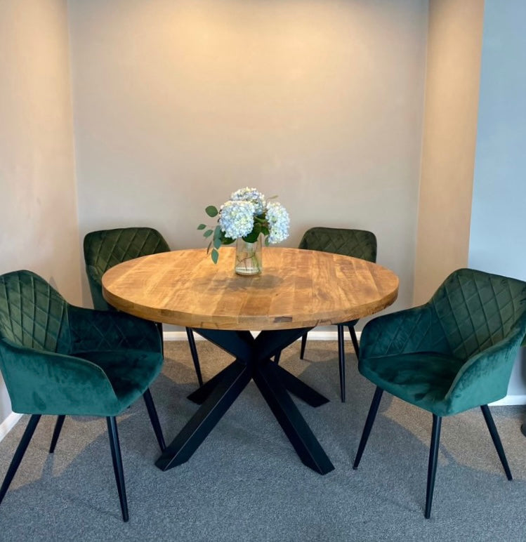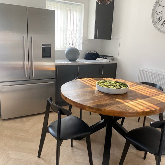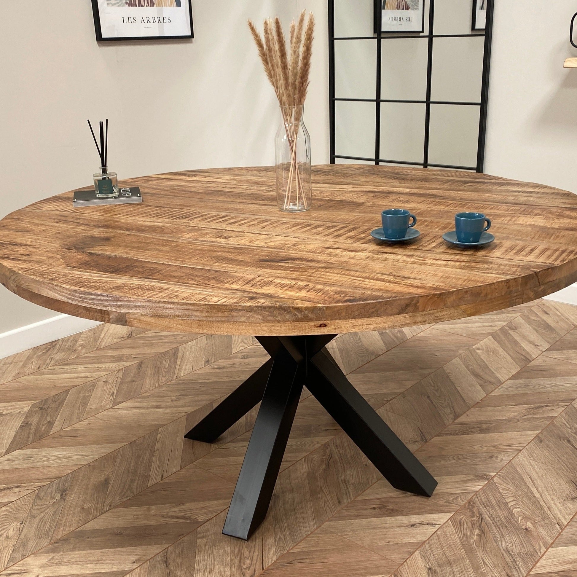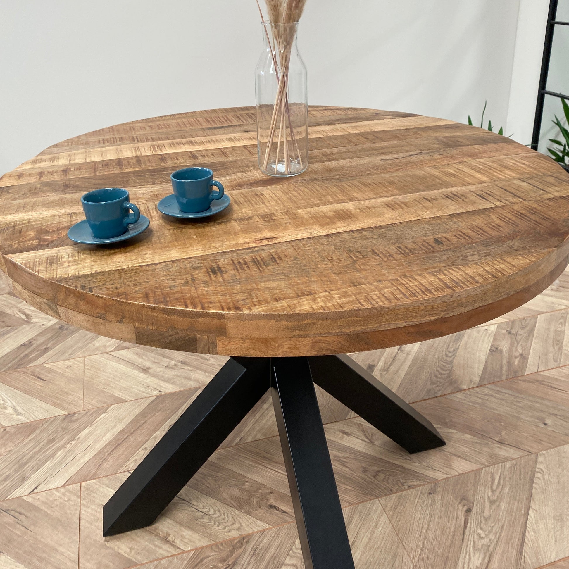 The Sara Round Industrial Dining Table is an elevated expression of modern industrial elegance. Handcrafted from premium solid Mango wood, its beautifully distressed surface is enhanced with a rich walnut finish, highlighting the natural grain and tonal depth of the timber. No two pieces are ever alike — each table is truly one of a kind.