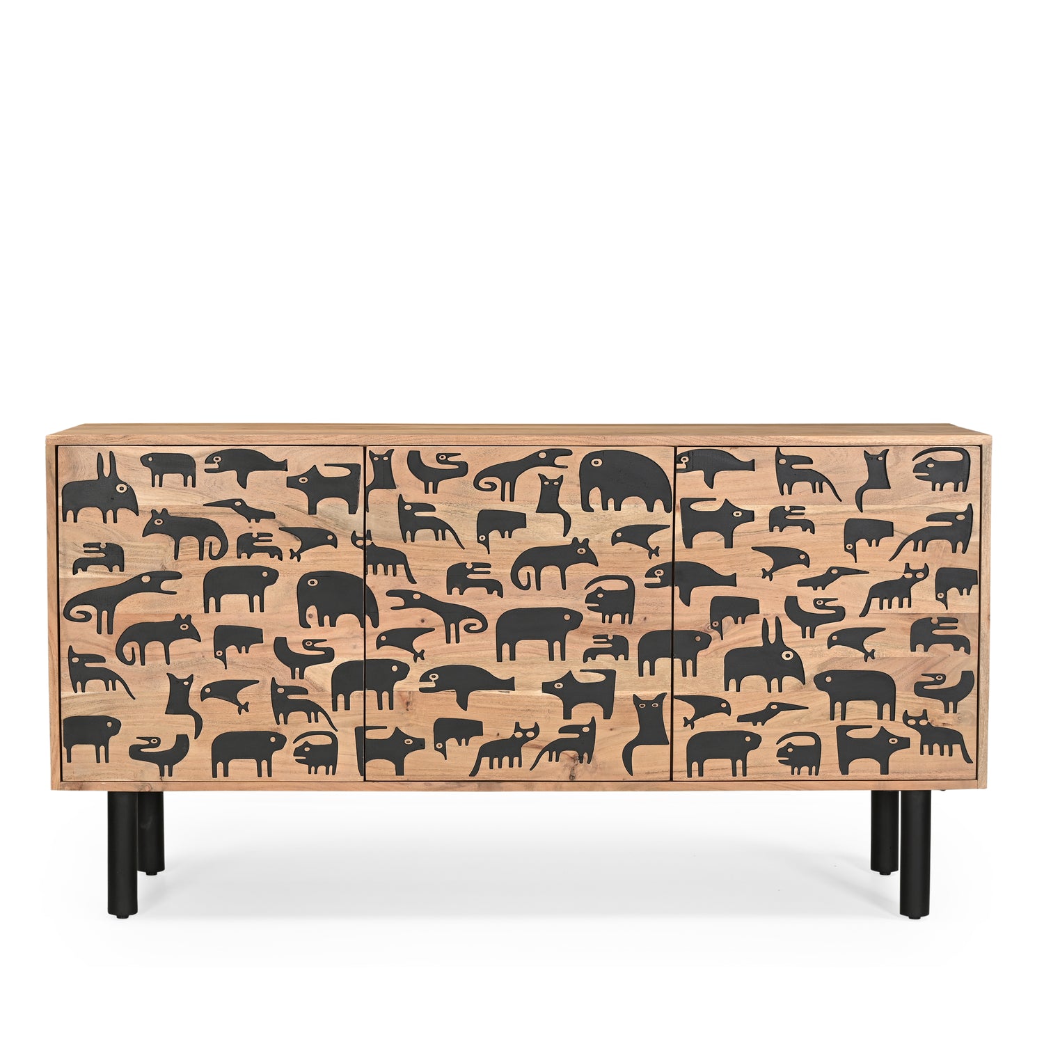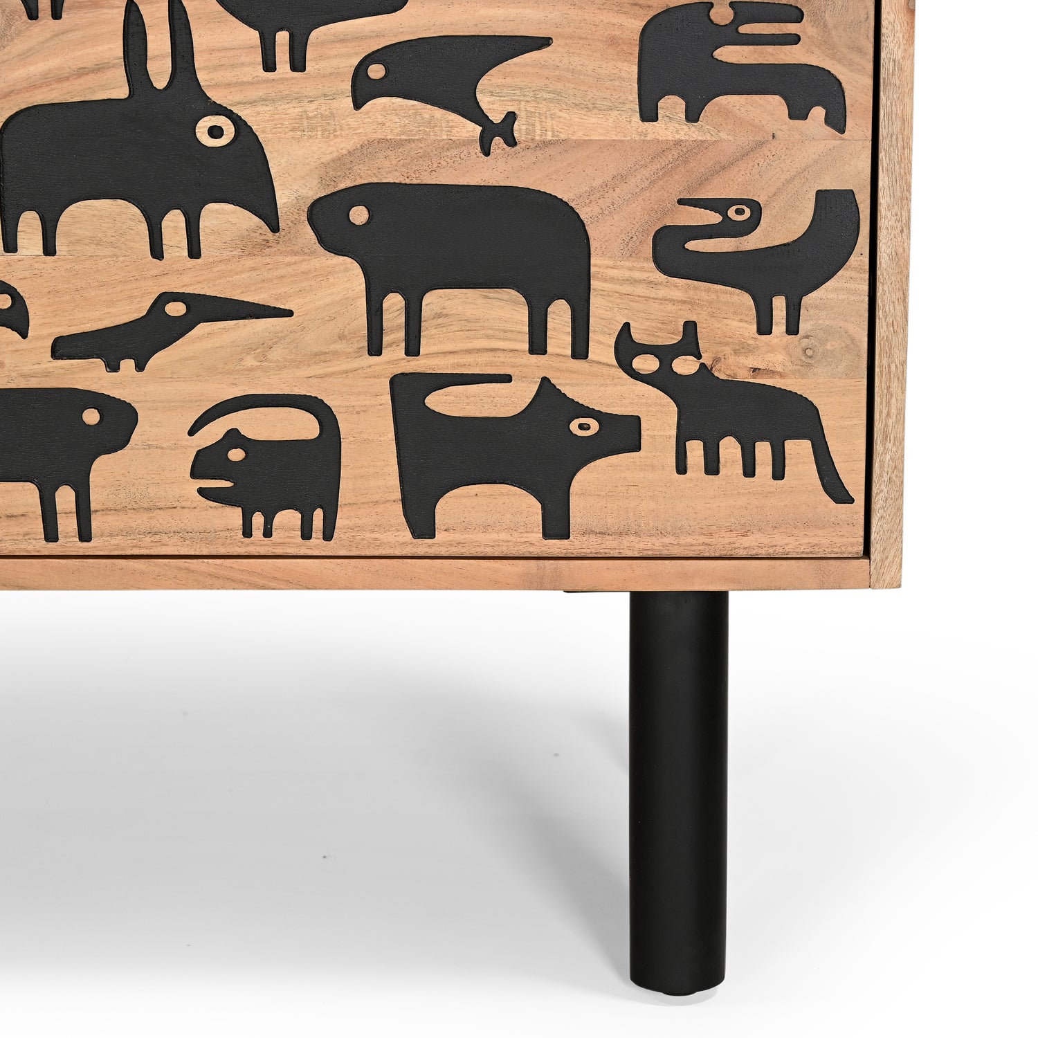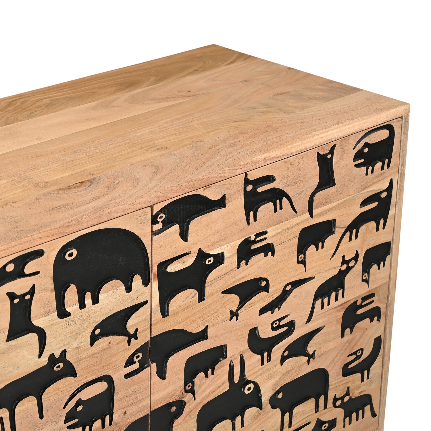 The front doors feature intricately engraved animal illustrations, each one hand-painted in black to create a bold contrast against the light, natural wood finish. These detailed engravings celebrate the elegance of iconic savannah wildlife, transforming the sideboard into a striking focal point for any room.