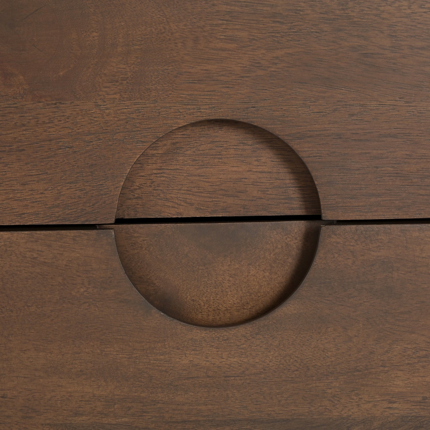 The standout feature; a recessed circular handle — is carved directly into the wood across both drawers, creating a seamless, minimalist look with subtle visual interest. Two spacious drawers offer practical storage for nighttime essentials, helping keep your space calm, tidy, and organised.