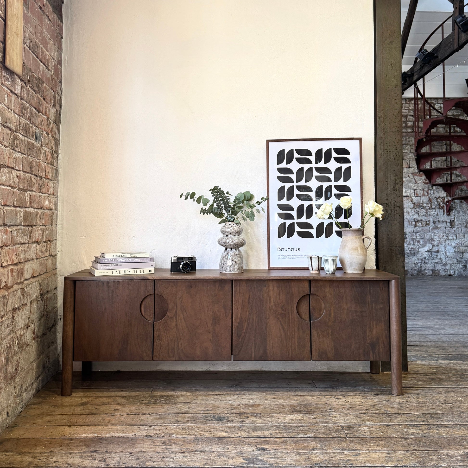 Thoughtfully integrated into the front are recessed circular handles, a subtle yet distinctive detail that enhances the refined, minimalist feel. Behind the four flush-fit doors, generous internal storage keeps media equipment, gaming accessories, and everyday clutter neatly out of sight, ensuring a calm and organised living space.