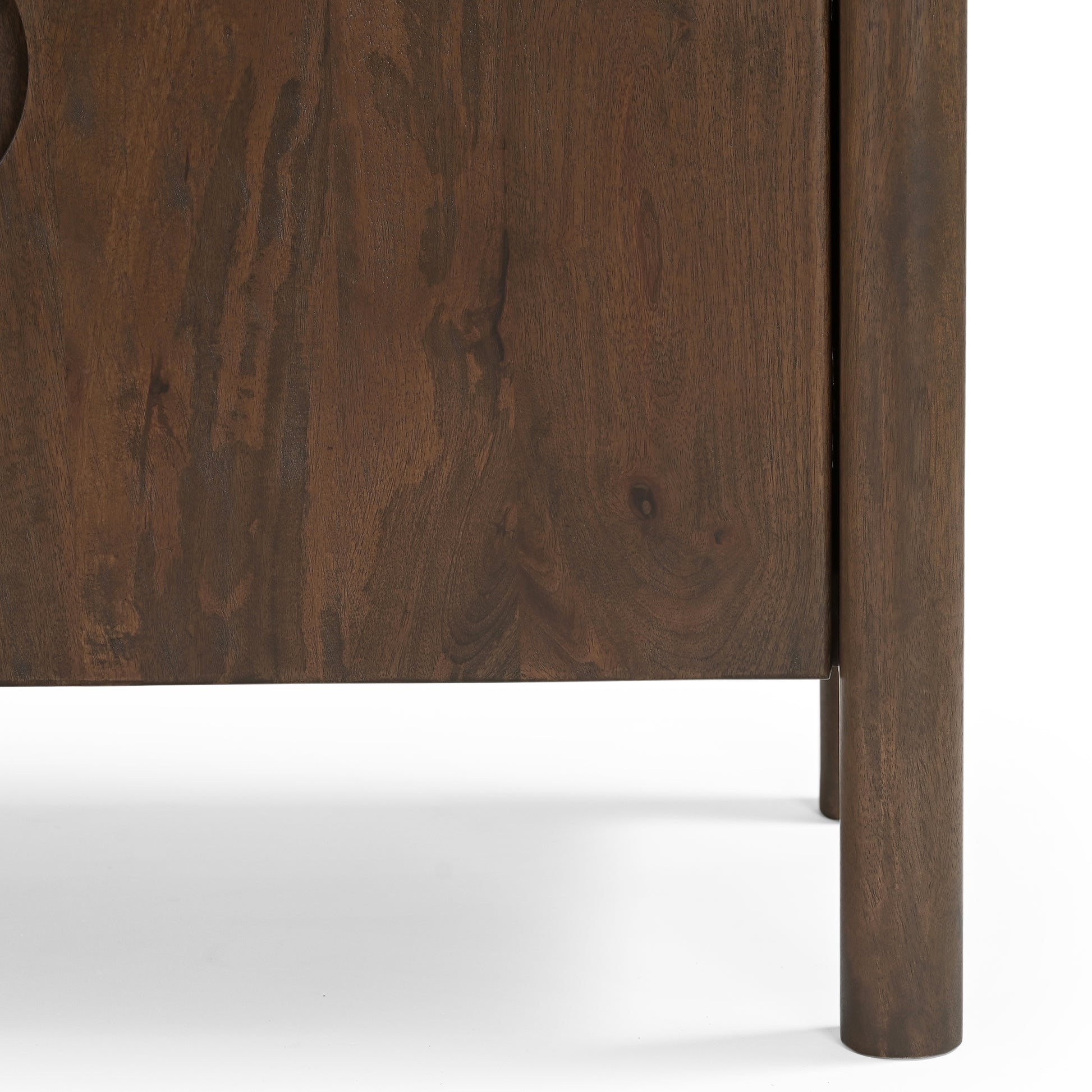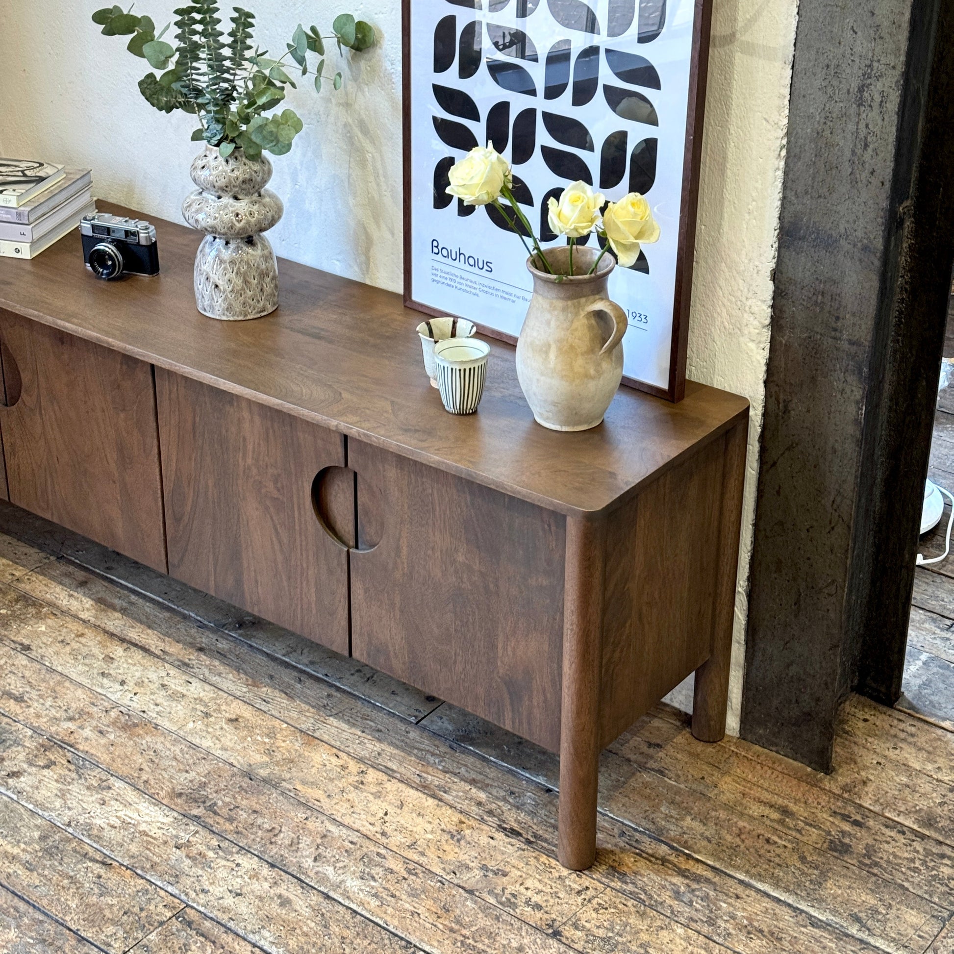 The Sydney TV stand a modern classic crafted with natural warmth. Built from solid mango wood and finished in a rich brown tone, the Sydney TV Stand celebrates the authentic beauty of timber with its smooth grain patterns and soft, rounded edges. Its clean-lined silhouette is elevated by cylindrical legs that add a touch of mid-century charm while keeping the design light and contemporary.