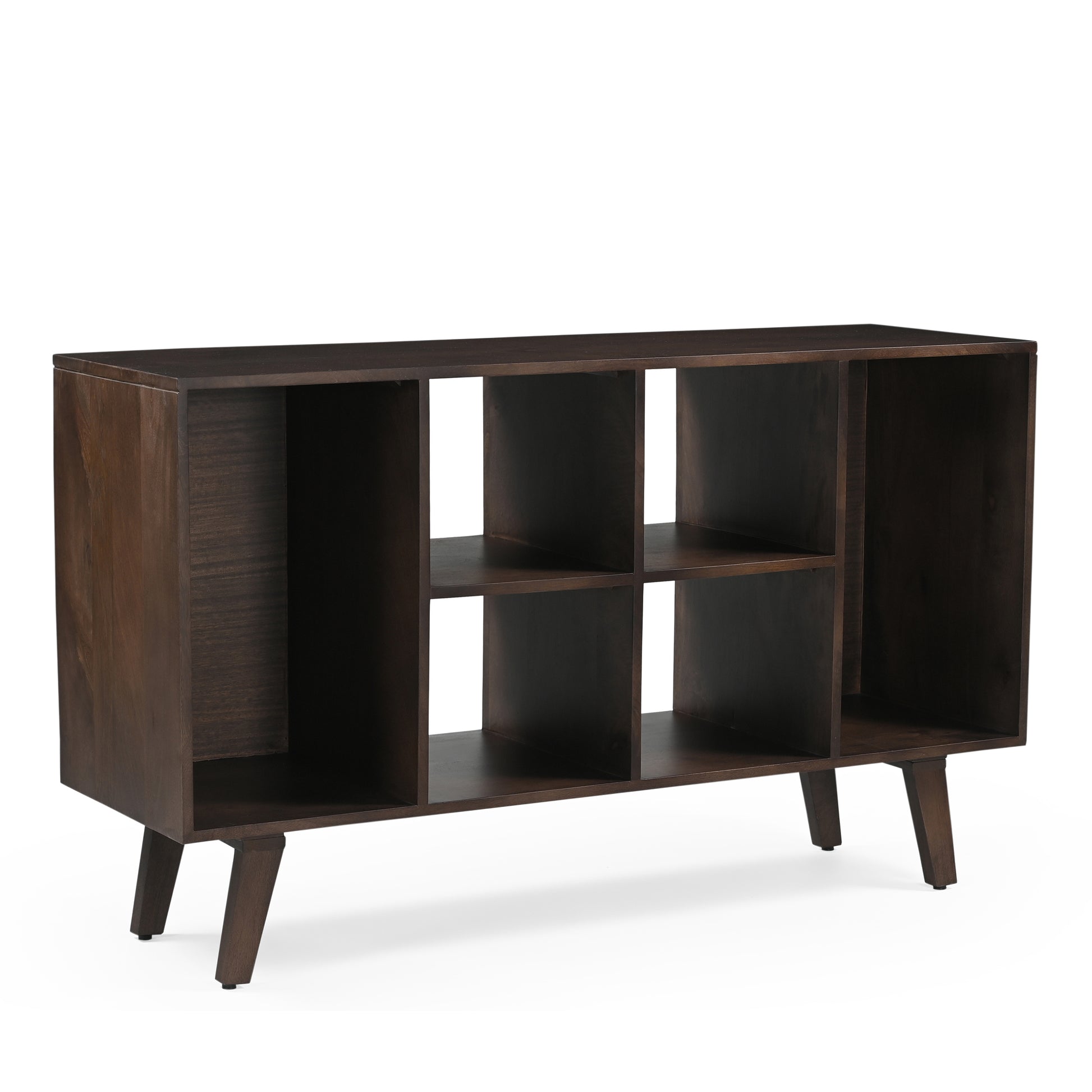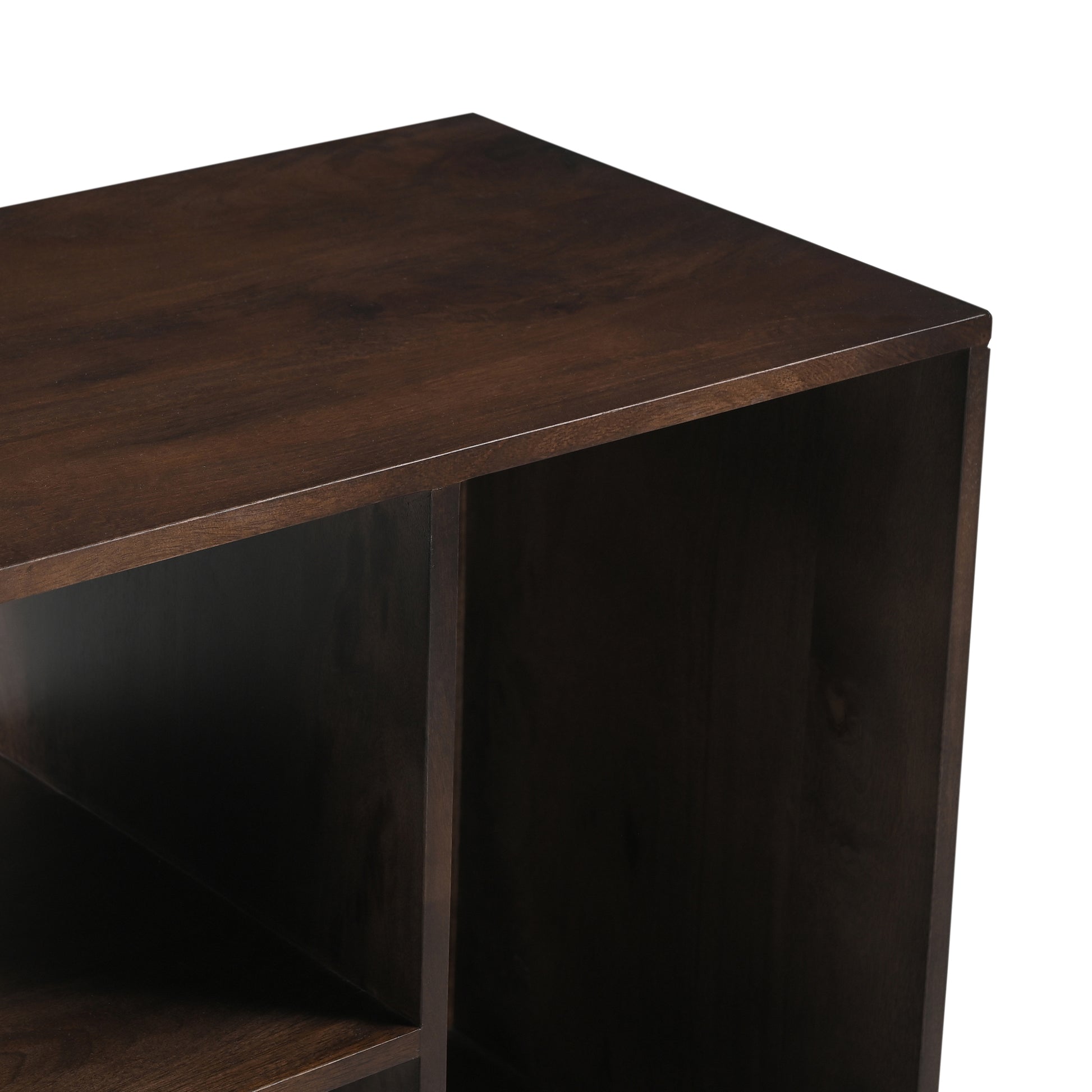 The deep walnut finish highlights the natural grain and texture of the mango wood, giving the piece a warm, sophisticated appeal. Its generous surface offers ample space for decorative displays or additional media, while the thoughtfully designed storage compartments keep your essentials organised and easily accessible.