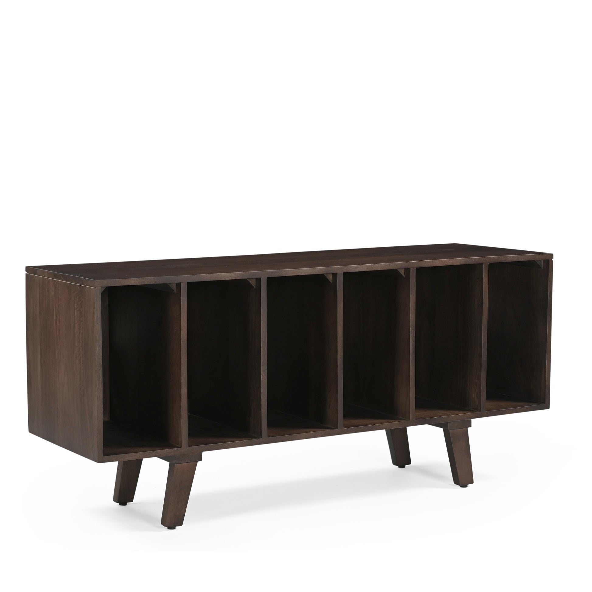 The deep walnut finish enhances the natural grain and texture of the mango wood, creating a sophisticated yet warm aesthetic. With a spacious surface for your TV and open storage compartments for easy access to records, books, or media devices, the Wax unit is as practical as it is stylish.
